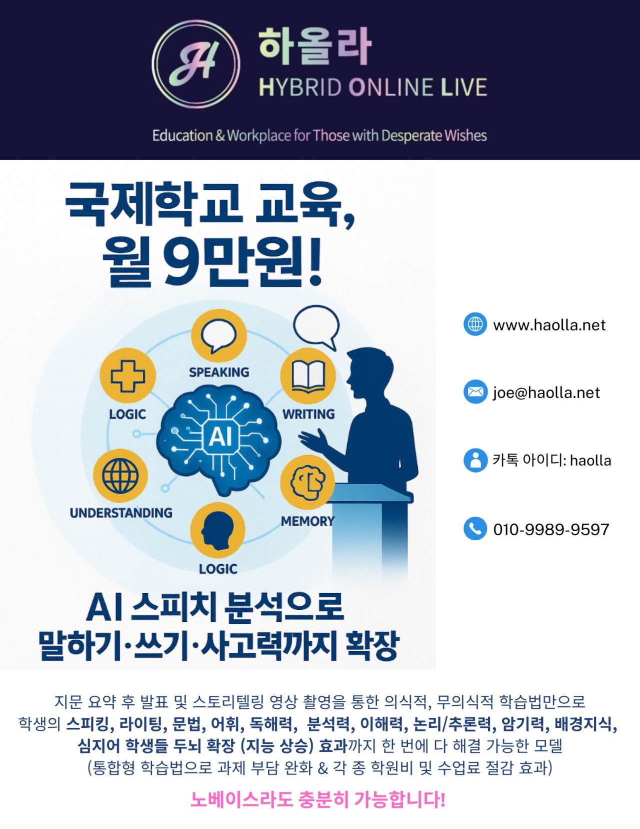 하올라 (HAOLLA)는 최근 AI 스피치 분석 기술을 기반으로 한 혁신적인 국제학교 이니셔티브를 통해 국내외에서 빠르게 확장하고 있습니다. 첨단 AI 도구의 접목으로 월 9만 원이라는 저렴한 비용으로 프로그램을 제공하고 있음에도 불구하고, 이미 다수의 학생들이 기존 국제학교를 뛰어넘는 성과를 달성한 사례가 있습니다. 이러한 성과는 해외에서도 큰 주목을 받고 있습니다. 본 이니셔티브는 한국 시장에 국한되지 않고 온라인 시스템을 통해 관리되기 때문에, 우리는 글로벌 리더들과 협력하여 이 모델을 전 세계로 확산시키고 있습니다. 여러분이 참여할 수 있는 영역과 그에 따른 혜택은 다음과 같습니다. - 새로운 학생을 연결하거나 현재 맡고 있는 학생과 본 프로그램을 연계할 경우, 건당 "10만 원" 추천 보너스 지급 - HAOLLA의 “Extreme Synergy” 2:1 마이크로 그룹 수업에서 리드 교사로 참여 - HAOLLA의 1:1 맞춤형 프로그램에서 지도 상세한 사항은 하기 링크드인 정보 통해서 확인 부탁드립니다. - HAOLLA의 AI 기반 학생 관리 프로그램에 참여 또한, 소외계층 아동들에게도 다가가기 위해 대규모 전통적인 전단지 홍보 캠페인도 진행하고 있습니다. 이번 이니셔티브와 학생 관리 시스템을 직관적으로 이해하실 수 있도록 전단지 초안을 첨부하였습니다. 가능한 많은 분들과의 협력을 기대합니다!