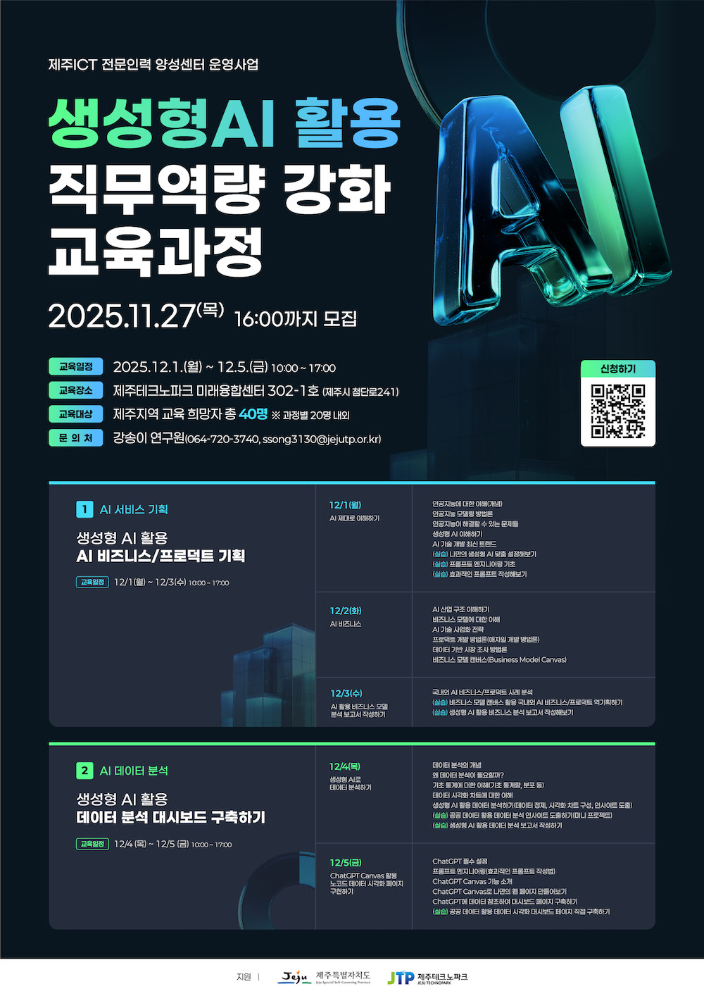제주ICT 전문인력 양성센터 운영사업의 일환으로 진행되는 본 과정은 AI 비즈니스/프로덕트 기획부터 데이터 분석 대시보드 구축까지, 실무에서 바로 사용할 수 있는 생성형 AI 활용법을 단계별로 배울 수 있도록 구성되었습니다.