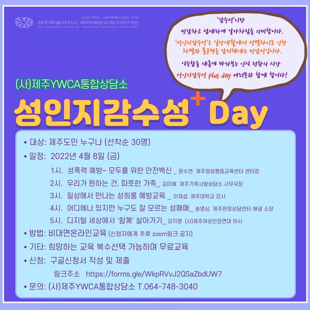 | 제 목 | (제주YWCA통합상담소) "성인지감수성 Plus Day" 교육안내 | ||