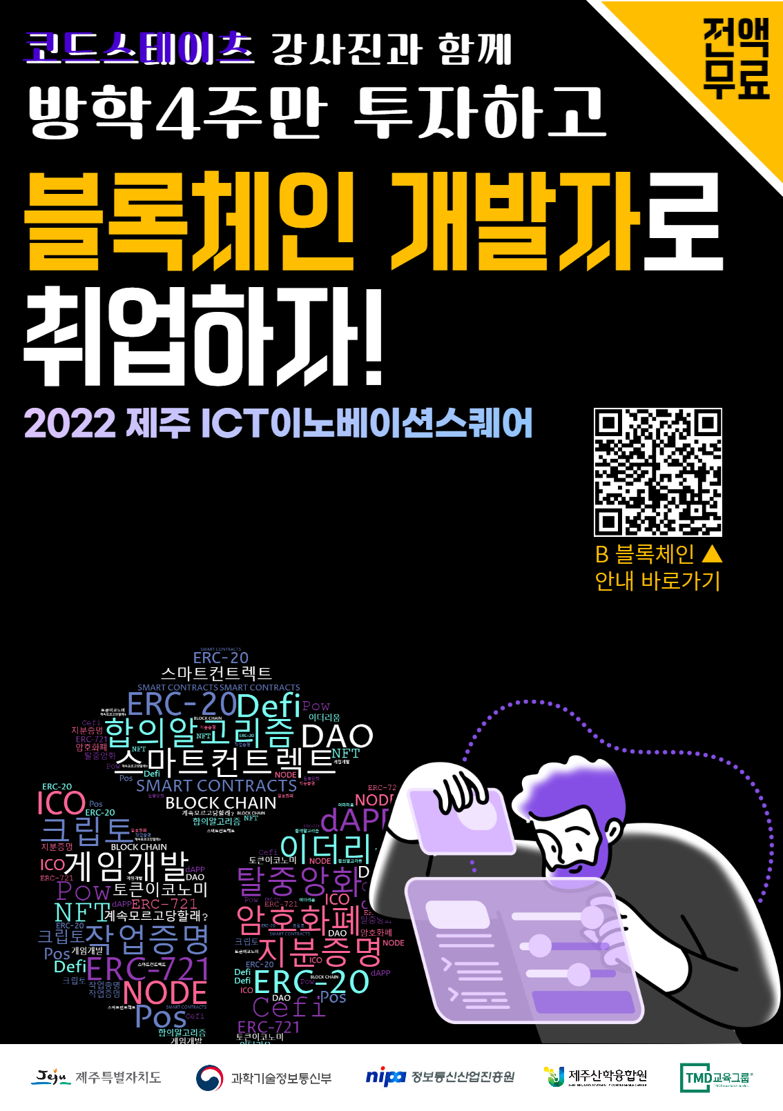 누구나 ‘블록체인 엔지니어 과정’을 통해 블록체인 개발자로 성장하고 구직 또는 창업을 준비할 수 있는 프로그램입니다.