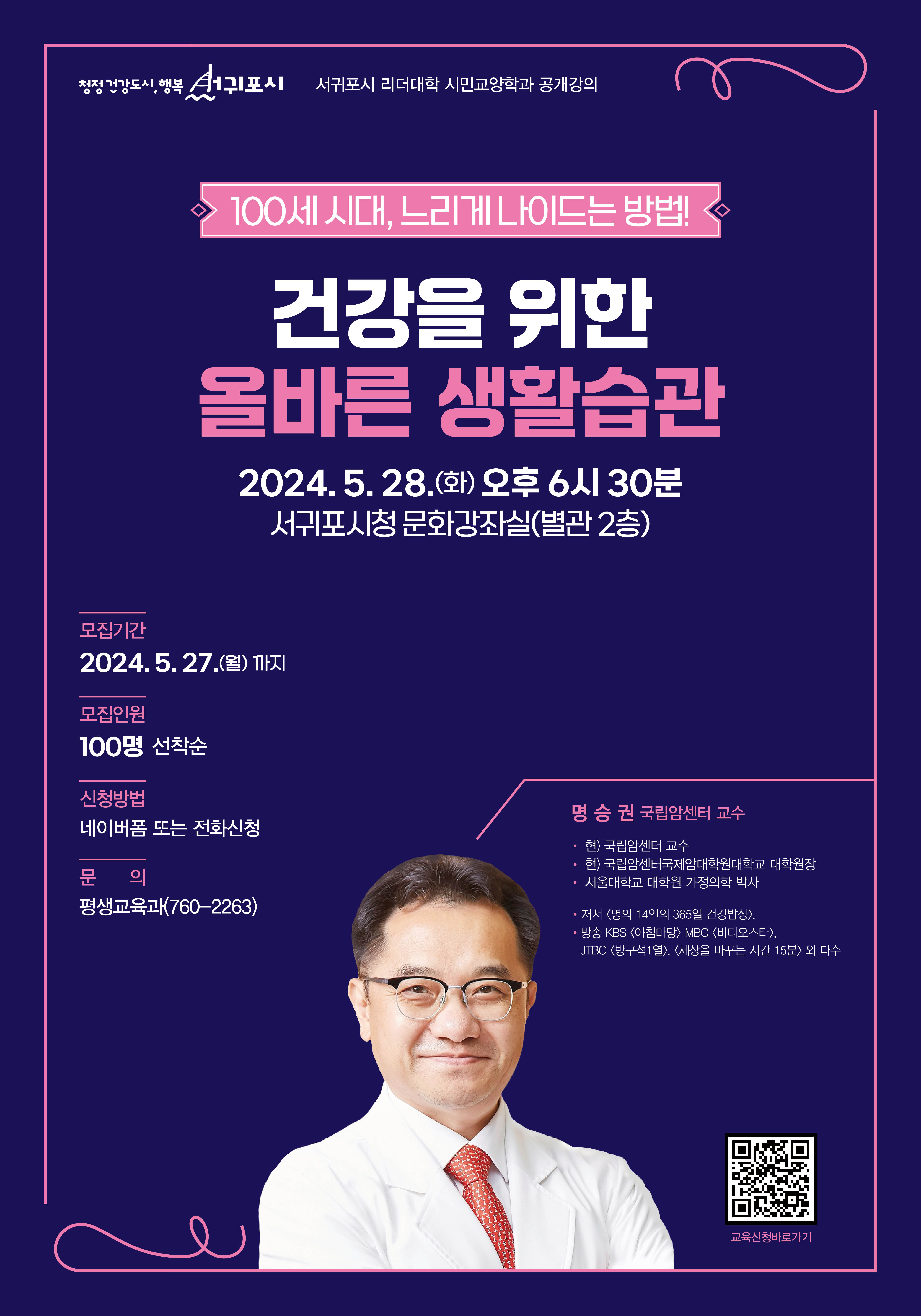 | 제 목 | 서귀포시 리더대학 명승권 교수 초청 '건강을 위한 올바른 생활습관(5.28.(화)) 사전신청 안내 | ||