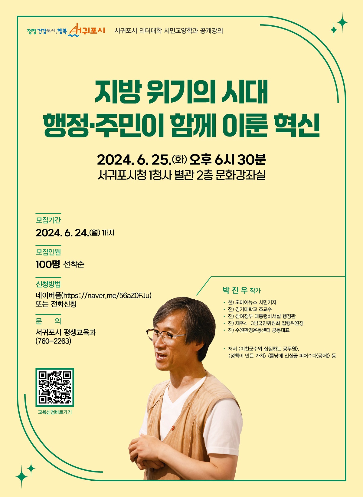 | 제 목 | 서귀포시 리더대학 [박진우 작가 초청 <지방 위기의 시대, 행정·주민이 함께 이룬 혁신>] 사전신청 안내 | ||