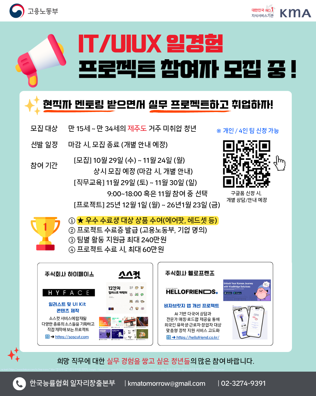 ? 기업별 프로젝트 안내 ? [주식회사 하이페이스] 일러스트 및 UI Kit 콘텐츠 제작 하이페이스는 디자인 중심의 IT 솔루션을 제공하며 UI/UX 혁신을 통해 새로운 사용자 경험을 만들어가는 기업입니다. 창의성과 기술을 결합해 디지털 환경에 적합한 비주얼 콘텐츠 제작을 지향합니다. 소스컷 서비스에 탑재될 다양한 소스들을 직접 기획·제작하는 프로젝트입니다. - UI Kit 제작 및 다양한 일러스트 리소스 개발 - 서비스 활용도를 높이는 비주얼 에셋 기획 ? [주식회사 헬로프렌즈] 비자브릿지 앱 개선 프로젝트 주식회사 헬로프렌즈는 외국인 유학생·근로자·창업가 등을 위한 맞춤형 행정·생활 지원 플랫폼 **‘비자브릿지(VisaBridge)’**를 운영하는 글로벌 에듀테크 기업입니다. 이번 프로젝트는 AI 기반 상담 고도화와 다국어 번역 품질 개선을 통해 외국인 사용자들의 행정·비자 절차 이용 편의성을 향상시키는 것을 목표로 합니다. - AI 챗봇 상담 정확도 및 UX 개선을 통한 서비스 고도화 - 26개 언어 번역 품질 향상 및 맞춤형 로드맵 서비스 설계 ■ 지원 자격 만 15세 ~ 34세 제주도 거주 미취업 청년 (대학생 휴학생, 졸업생, 재학생 모두 가능) ■ 모집 기간 ~2025년 11월 24일 (월) 23:59까지 ※ 참여자 접수 상황에 따라 조기 마감 가능 ■ 지원 방법 구글폼 응답 (https://forms.gle/2rw7C9WD8VXtZMMD9)및 간단한 신청 서류 제출! (구글폼 응답 시, 서류 제출 개별 안내 예정) ■ 활동 내용 4인 1팀으로 희망하는 기업의 프로젝트 수행 (25. 12. 1. ~ 26. 1. 23.) - 팀(4인)을 이루어 신청 가능 - 개인 신청 가능 (1~3인의 경우, 타 지원자와 매칭하여 팀 형성 예정) ■ 참여 혜택 1. 우수 수료생 대상 상품 증정 (에어팟, 소니 헤드셋, 로지텍 마우스 등) 2. 프로젝트 수료증 발급 (고용노동부·기업 명의) 3. 팀별 활동 지원금 최대 240만 원 4. 프로젝트 수료 시 최대 60만 원 지급 5. 각 기업 실무/현직자의 팀별 멘토링 진행 ? 희망 직무에 대한 실무 경험을 쌓고 싶은 청년들의 많은 참여 바랍니다! ■ 문의 사항 한국능률협회 일자리창출본부 T: ***-***-****