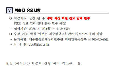 | 강좌명 | 2026년 제주도민 외국어 학습비 지원 - 외국어 학원 회화과정 제3기(5월) 학습비 지원 학습자 모집(기타언어) - | 계좌번호 | |