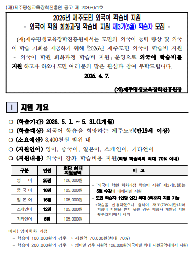 | 강좌명 | 2026년 제주도민 외국어 학습비 지원 - 외국어 학원 회화과정 제3기(5월) 학습비 지원 학습자 모집(기타언어) - |