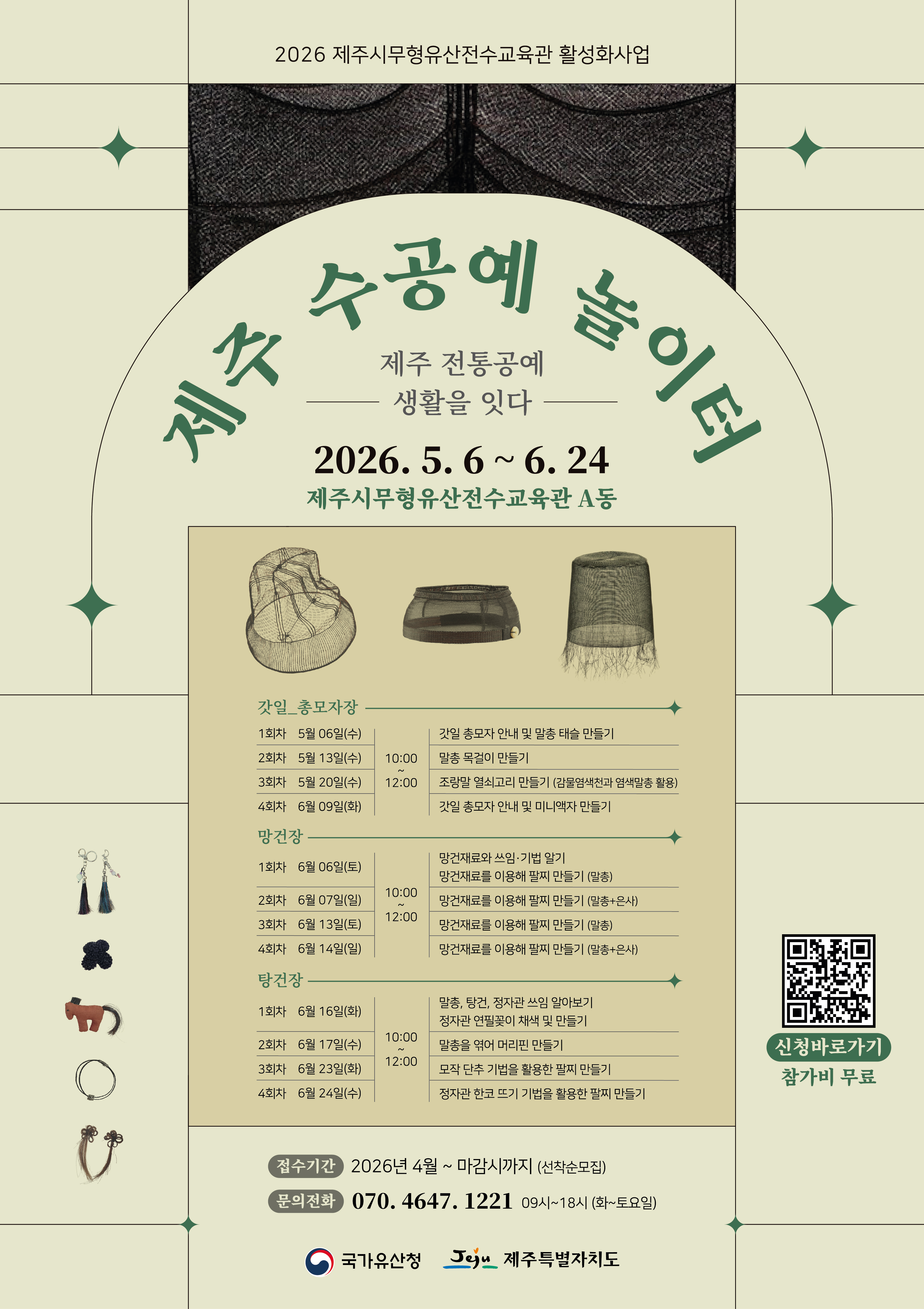 ㅇ 체험 기간 : 2026년 5월 6일 ~ 6월 24일 (총12회) ㅇ 체험 시간 : 10:00~12:00 (날짜는 프로그램표 참고) ㅇ 체험 장소 : 제주특별자치도 제주시 사라봉길 75 제주시무형유산전수교육관 A동 ㅇ 문의 전화 : 070-4647-1221 ㅇ 문의 가능시간 : 화~토요일 9시 ~ 18시