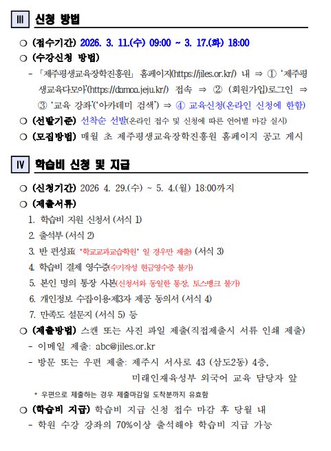 | 강좌명 | 2026년 제주도민 외국어 학습비 지원 - 외국어 학원 회화과정 제2기(4월) 학습비 지원 학습자 모집(일본어) - | 계좌번호 | |