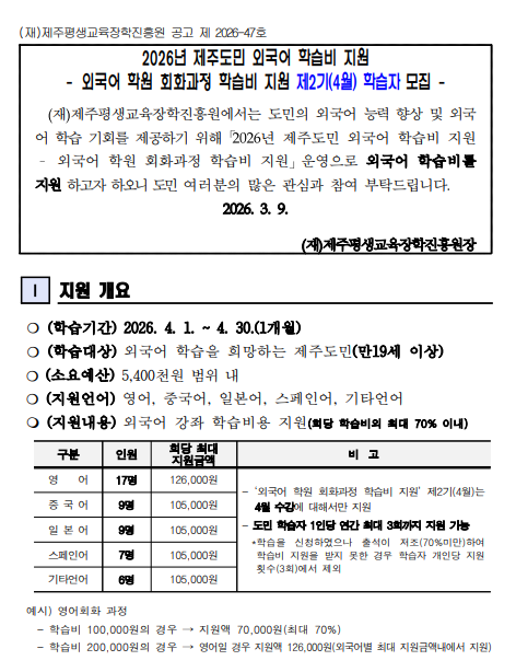 | 강좌명 | 2026년 제주도민 외국어 학습비 지원 - 외국어 학원 회화과정 제2기(4월) 학습비 지원 학습자 모집(일본어) - |