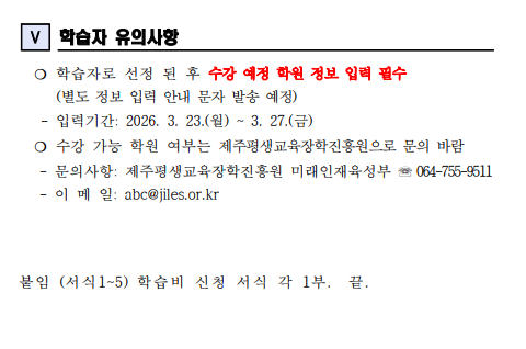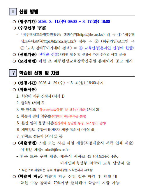 | 강좌명 | 2026년 제주도민 외국어 학습비 지원 - 외국어 학원 회화과정 제2기(4월) 학습비 지원 학습자 모집(기타언어) - | 계좌번호 | |