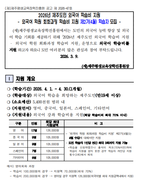 | 강좌명 | 2026년 제주도민 외국어 학습비 지원 - 외국어 학원 회화과정 제2기(4월) 학습비 지원 학습자 모집(기타언어) - |
