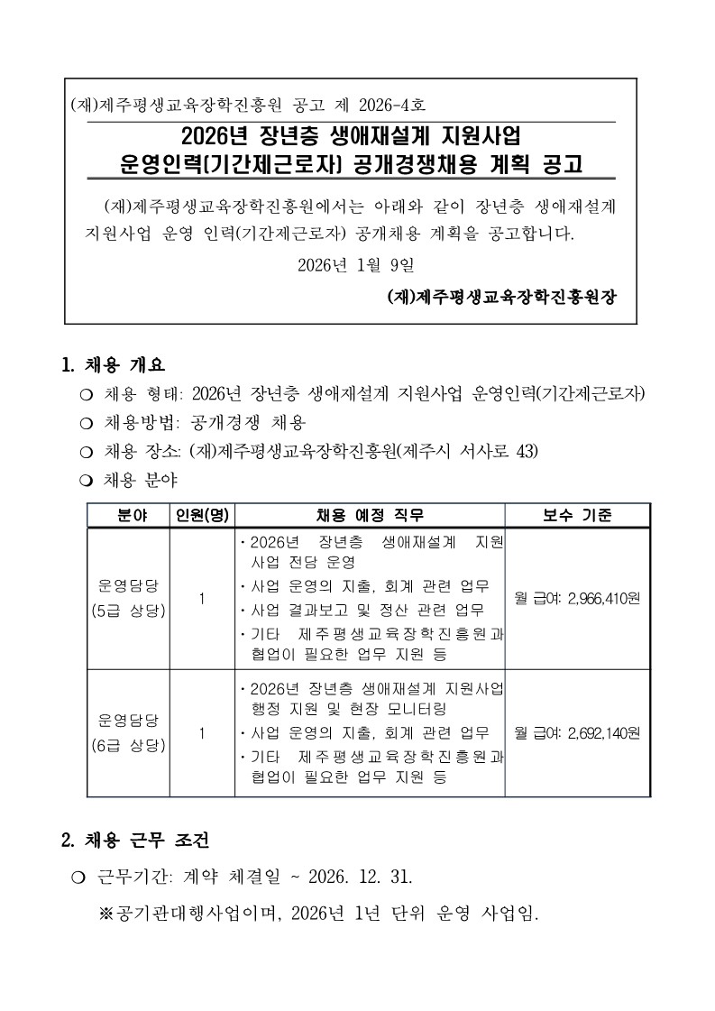 | 제 목 | 2026년 장년층 생애재설계 지원사업 운영인력(기간제근로자) 공개경쟁채용 계획 공고 | ||