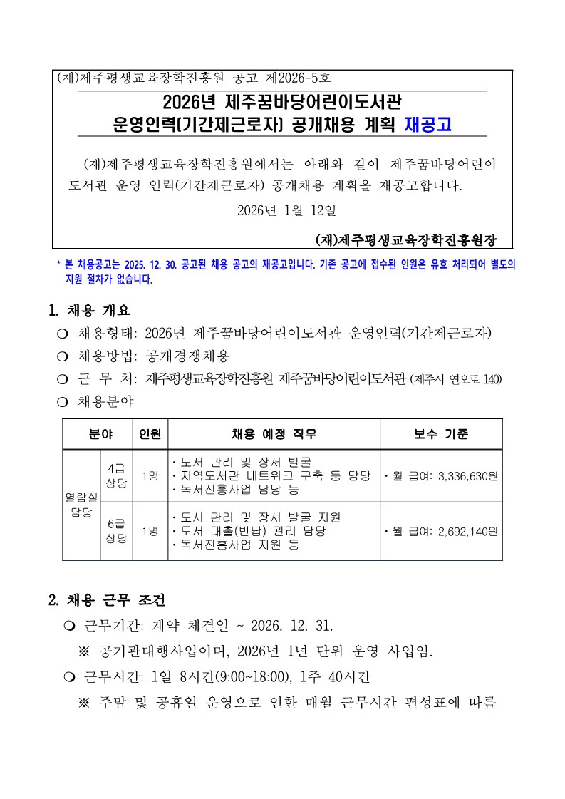 | 제 목 | 2026년 제주꿈바당어린이도서관 운영인력(기간제근로자) 공개채용 계획 재공고 | ||