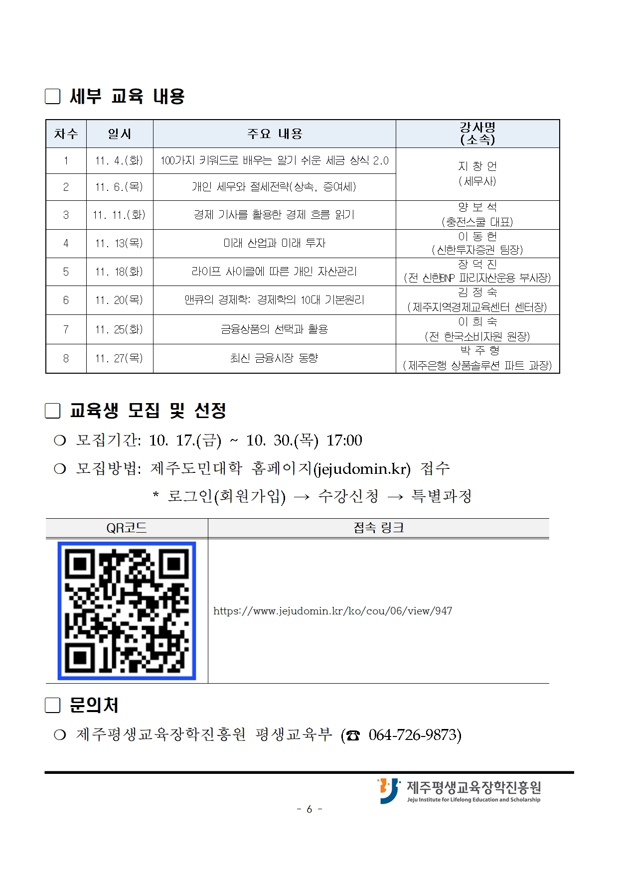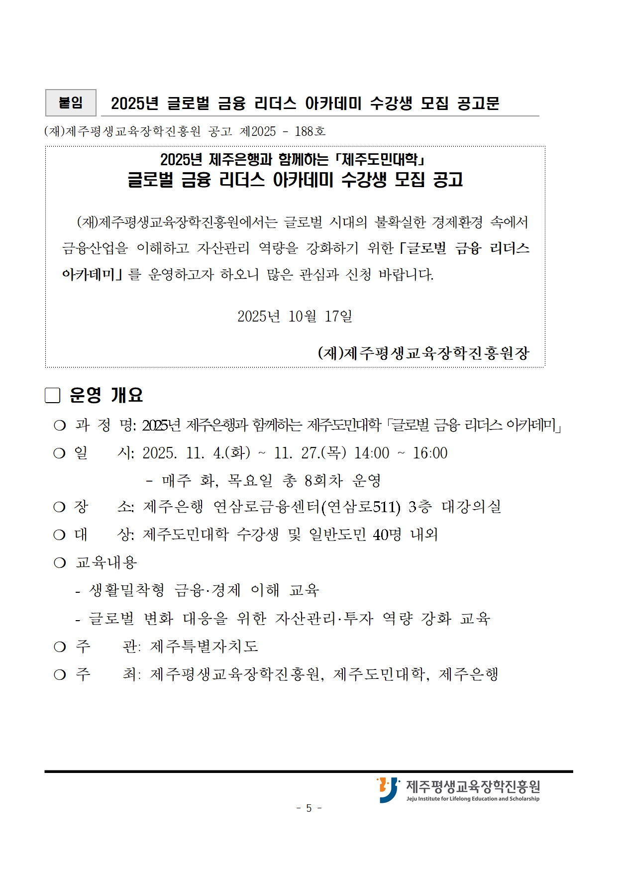 2025년 제주도민대학 「글로벌 금융 리더스 아카데미」수강생 모집 공고