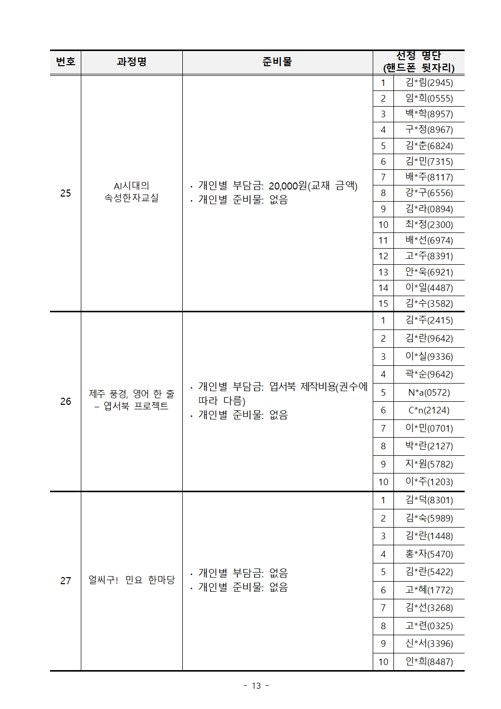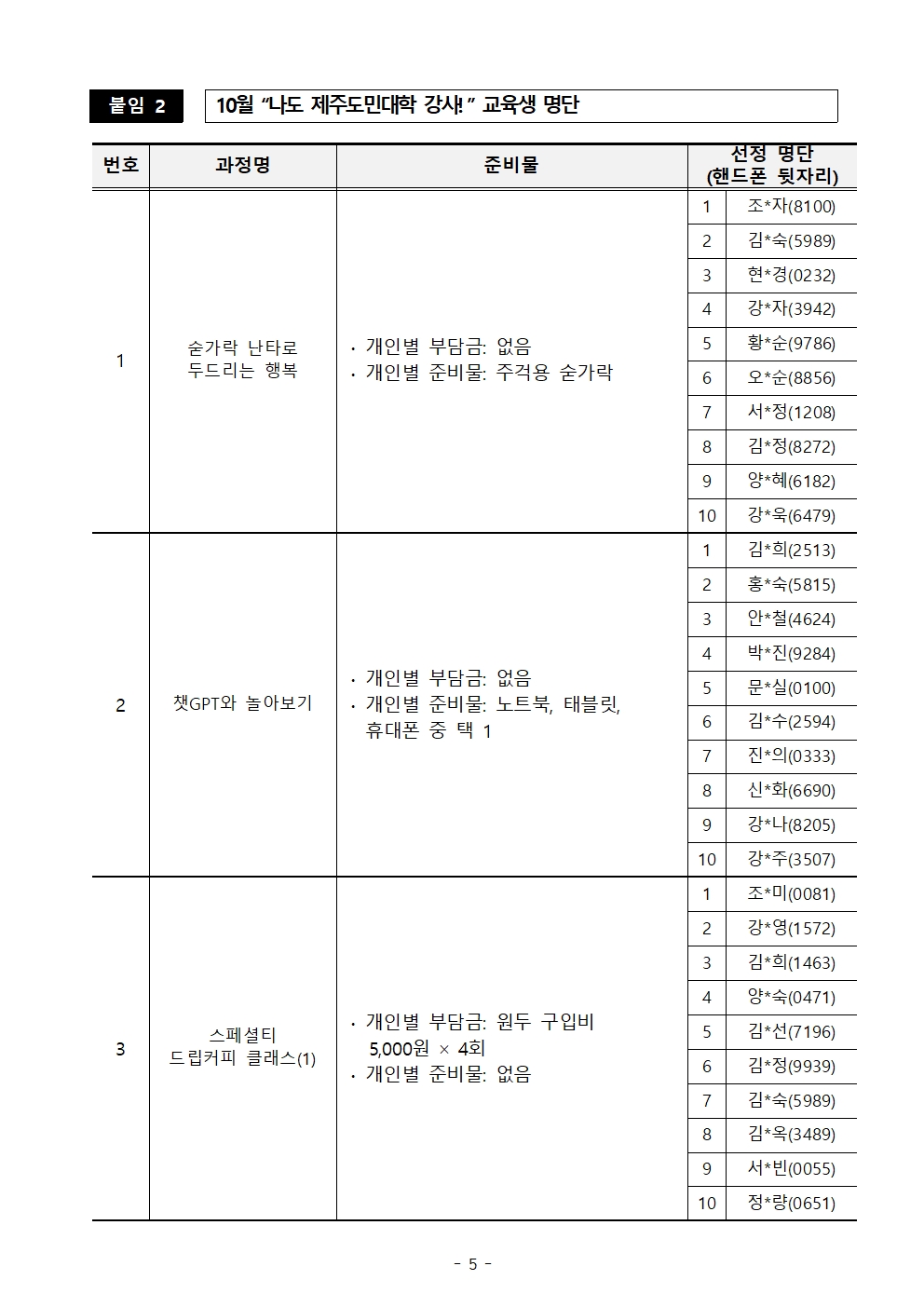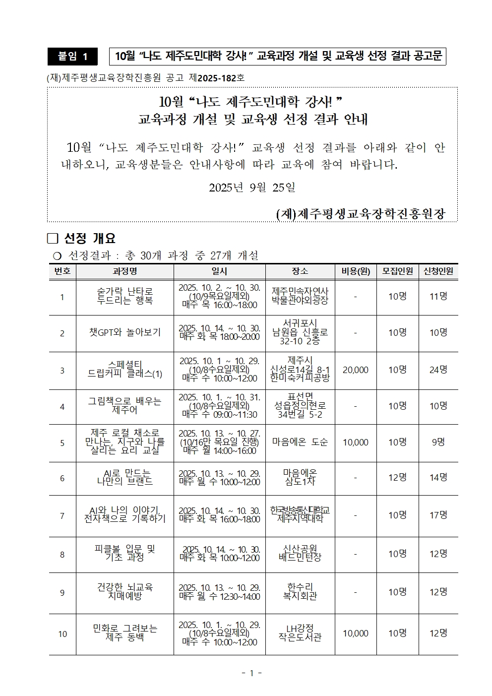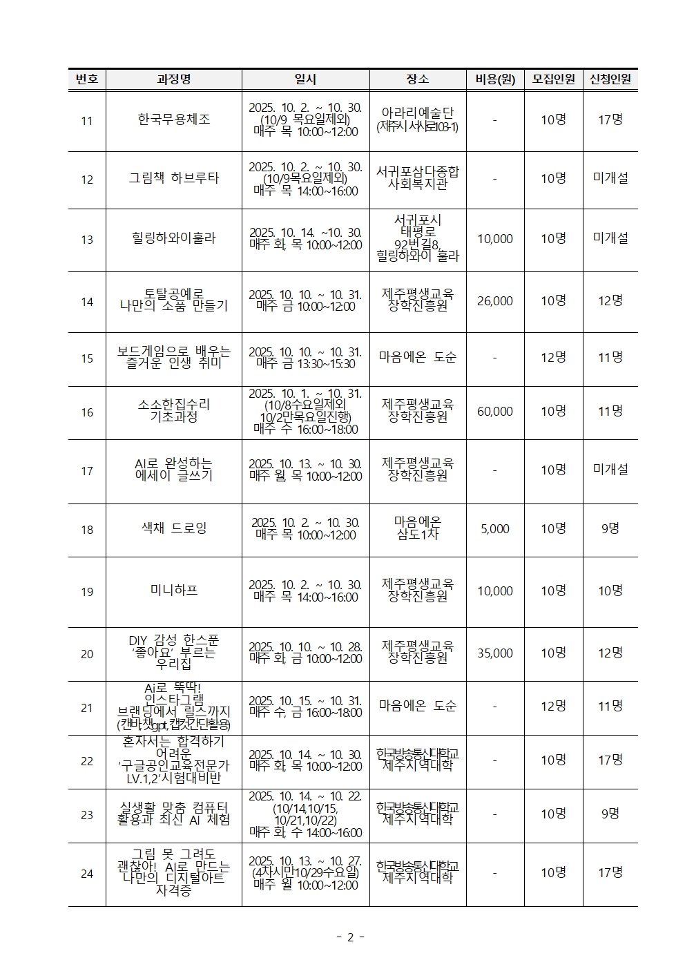 10월 「나도 제주도민대학 강사!」 교육과정 개설 및 교육생 선정 결과