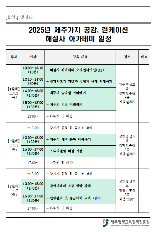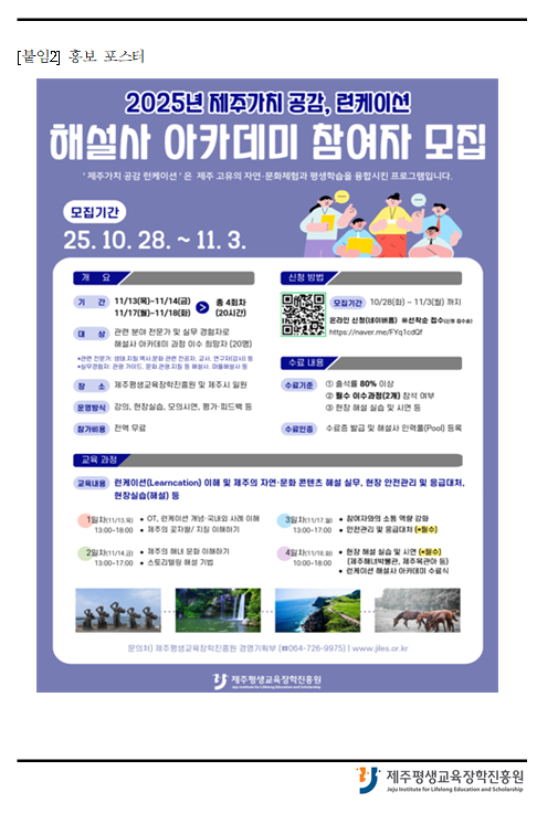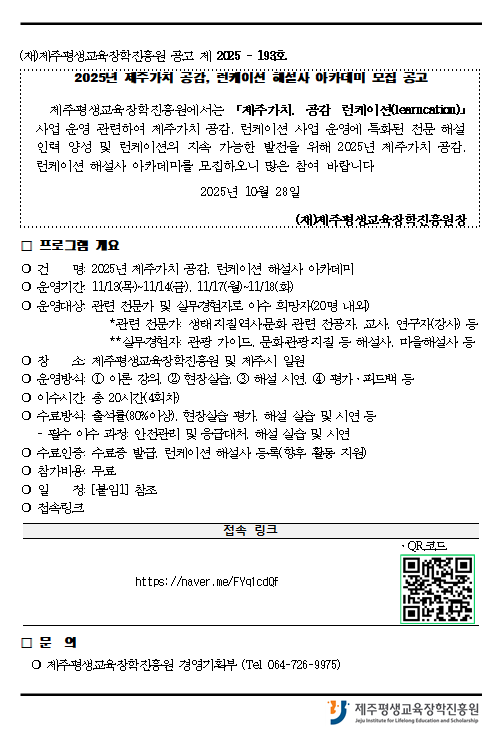 | 제 목 | 2025년 제주가치 공감, 런케이션 해설사 아카데미 모집 공고(10/28 ~ 11/3) | ||