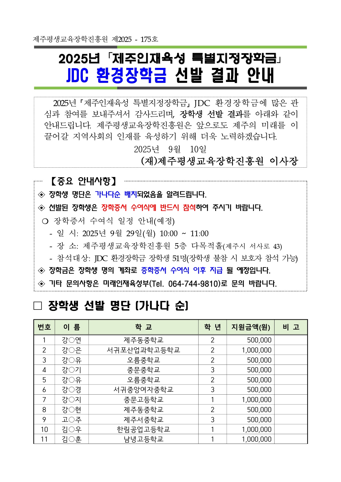 | 제 목 | 2025년 「제주인재육성 특별지정장학금」 JDC 환경장학금 선발 결과 안내 | ||