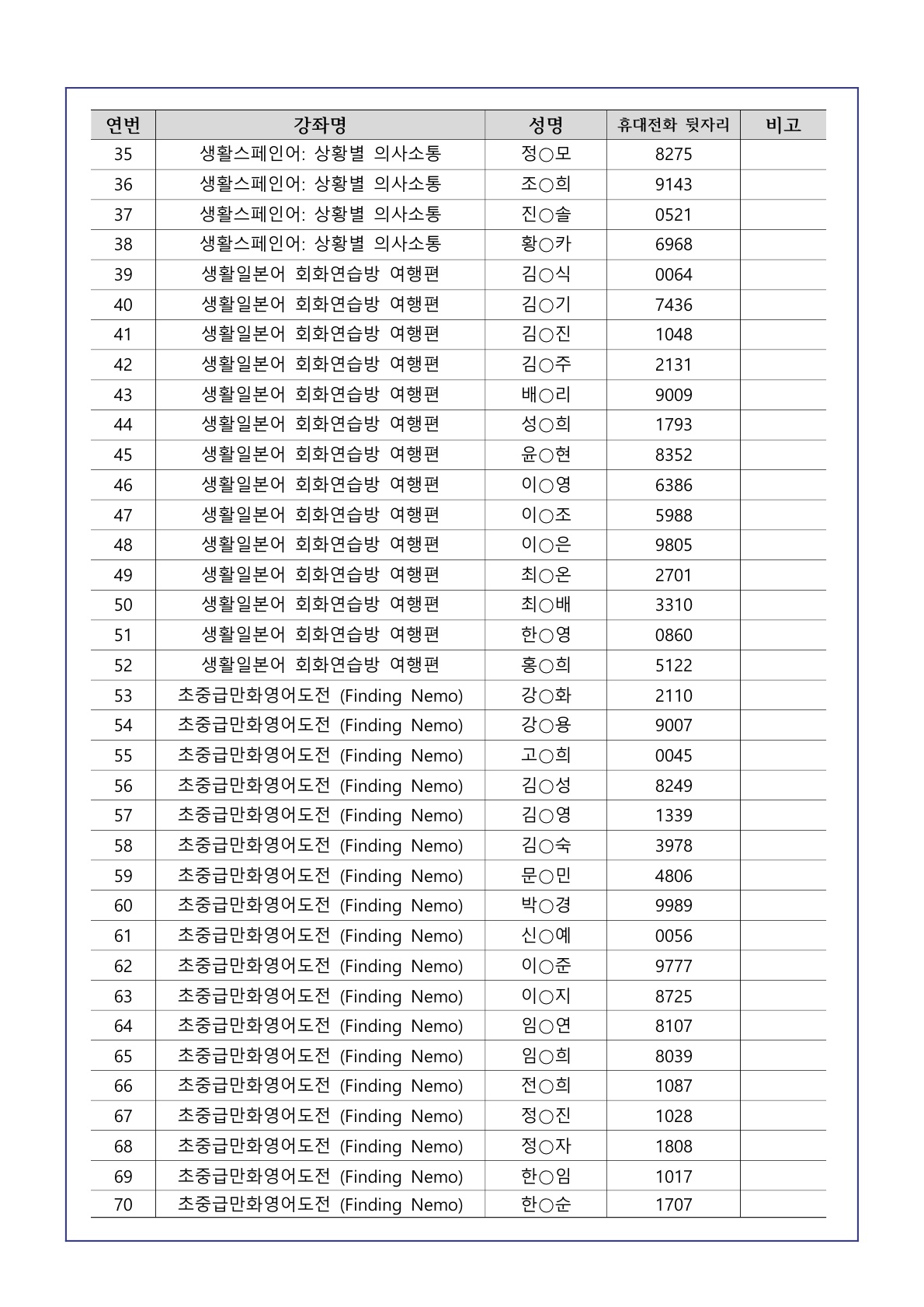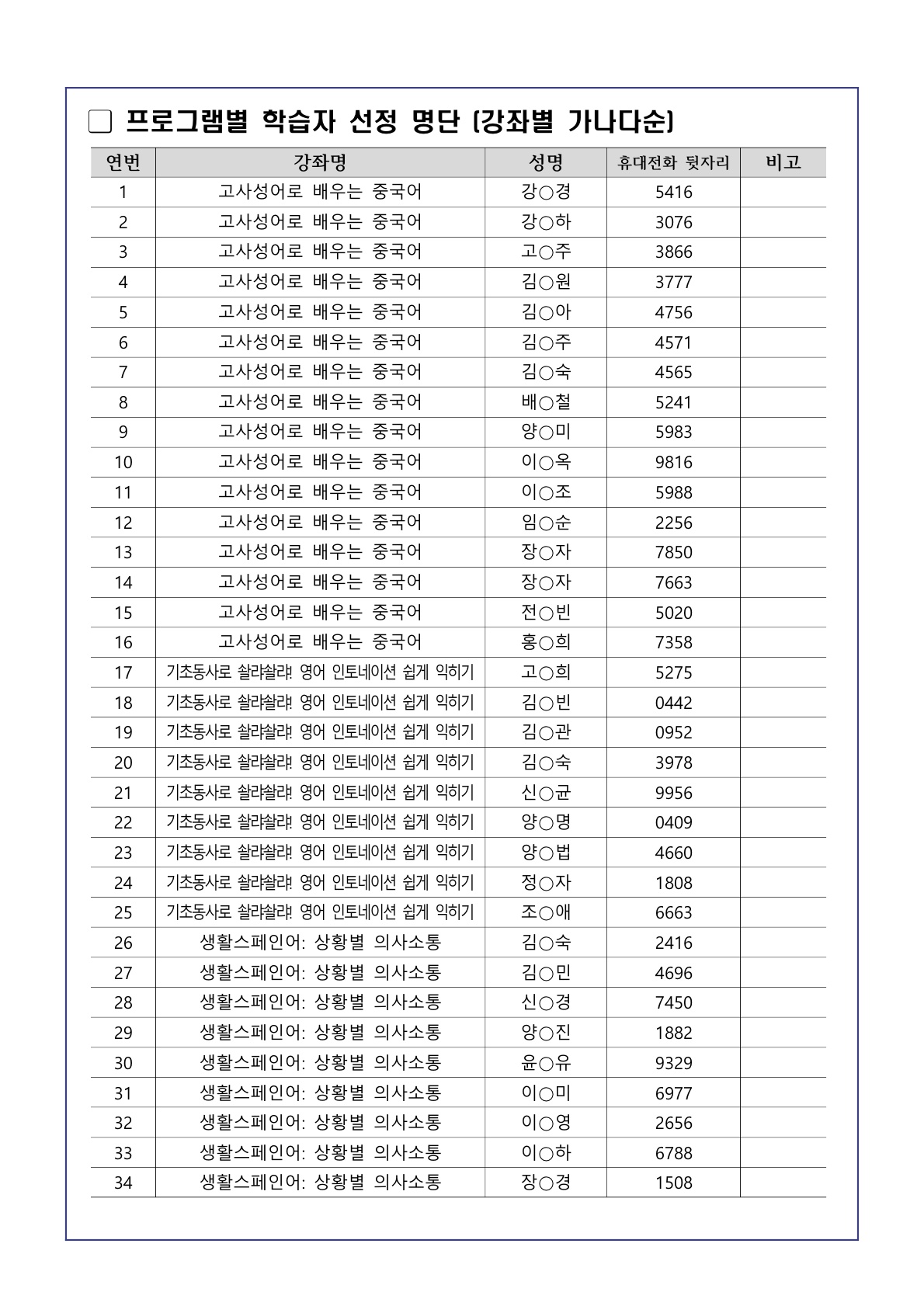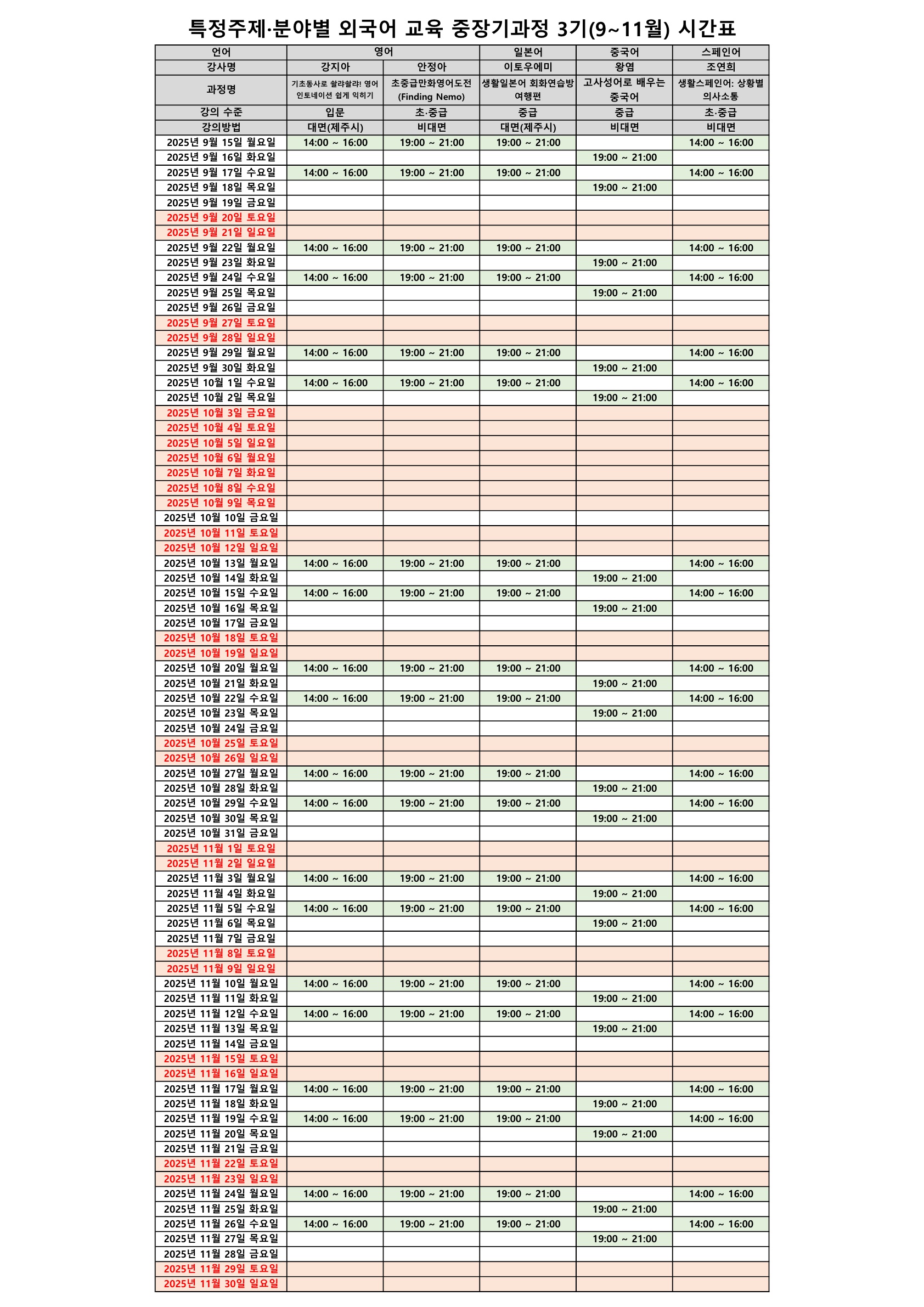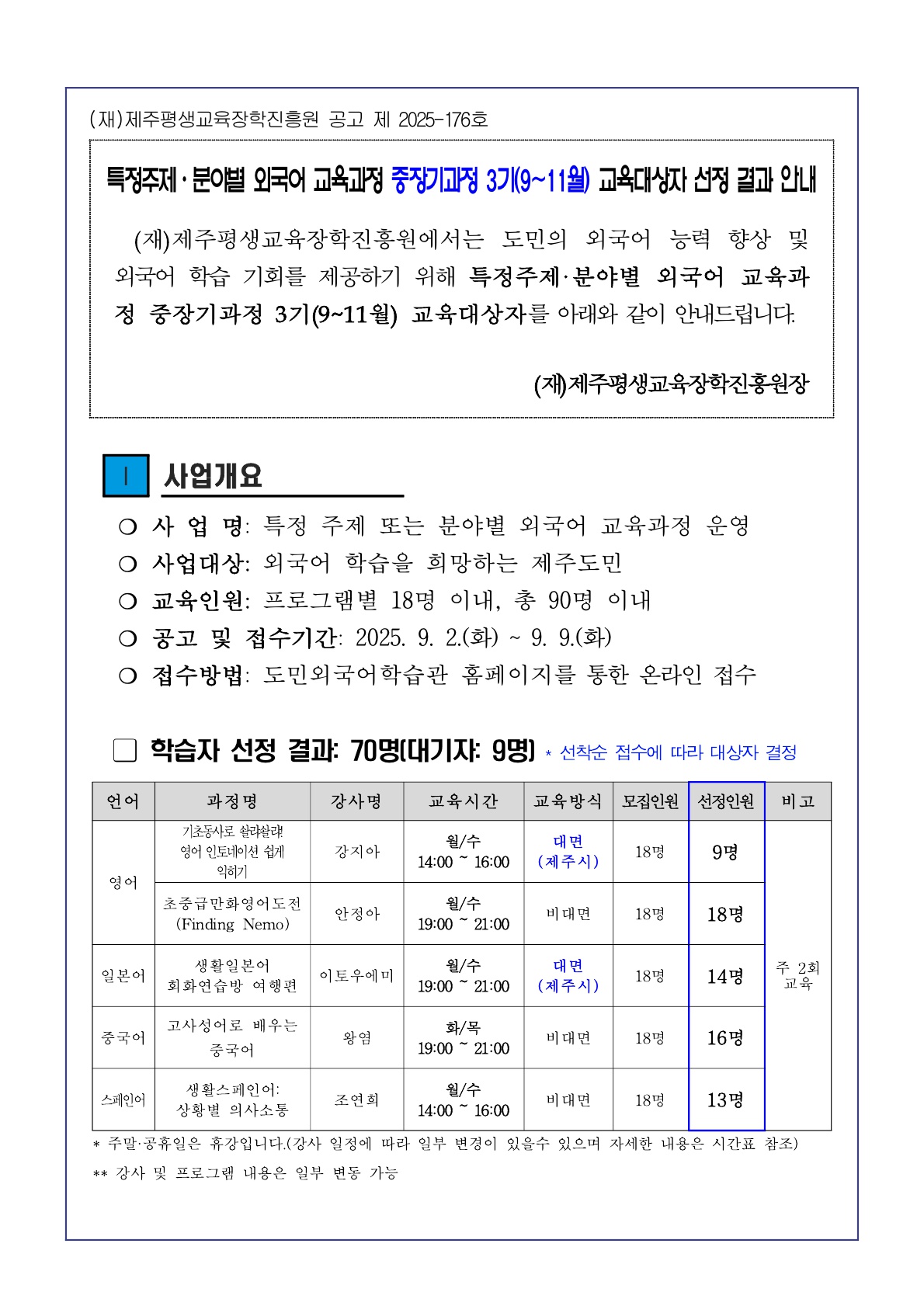 | 제 목 | 특정주제.분야별 외국어 교육과정 중장기과정 3기(9~11월) 교육대상자 선정 결과 안내 | ||
