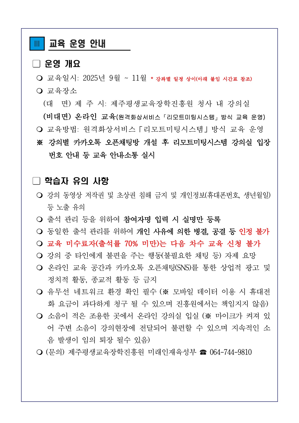 ※ 강의별 교육시간표를 반드시 확인부탁드립니다. ※ 첫 수업 전까지 카카오톡 오픈채팅방 미입장시 수강 취소로 간주되오니 반드시 입장바랍니다. (입장안내 별도 문자 발송 예정) ※ 교육 미수료시(출석률 70%이상) 다음 차수 신청이 불가합니다. ※ 자세한 내용은 공고문 및 강의시간표를 확인바랍니다. ※ 강의 난이도 및 시간표를 확인하지 않아 발생하는 문제는 신청자 본인에게 있습니다.