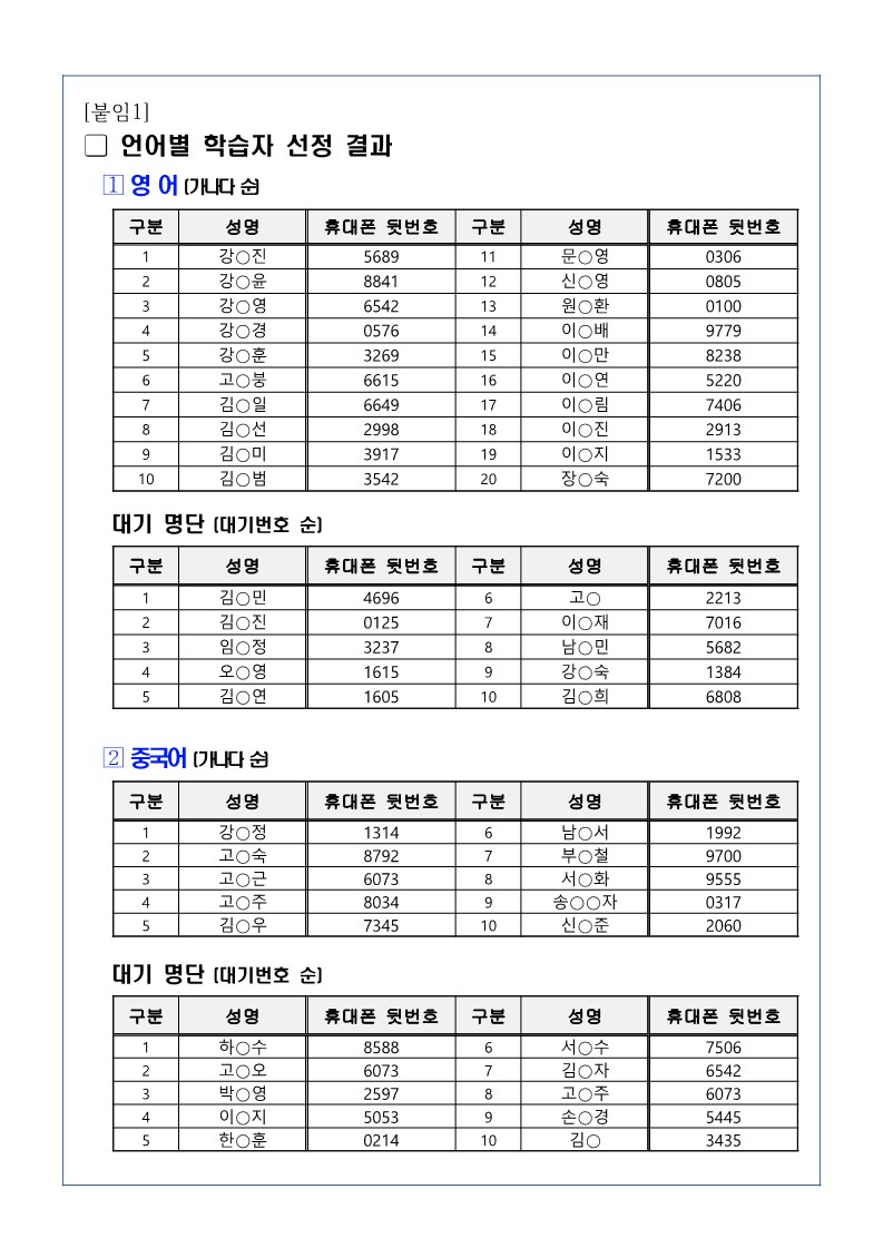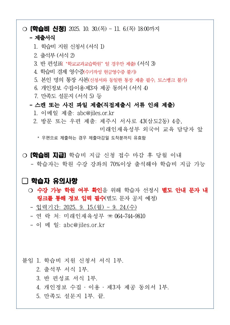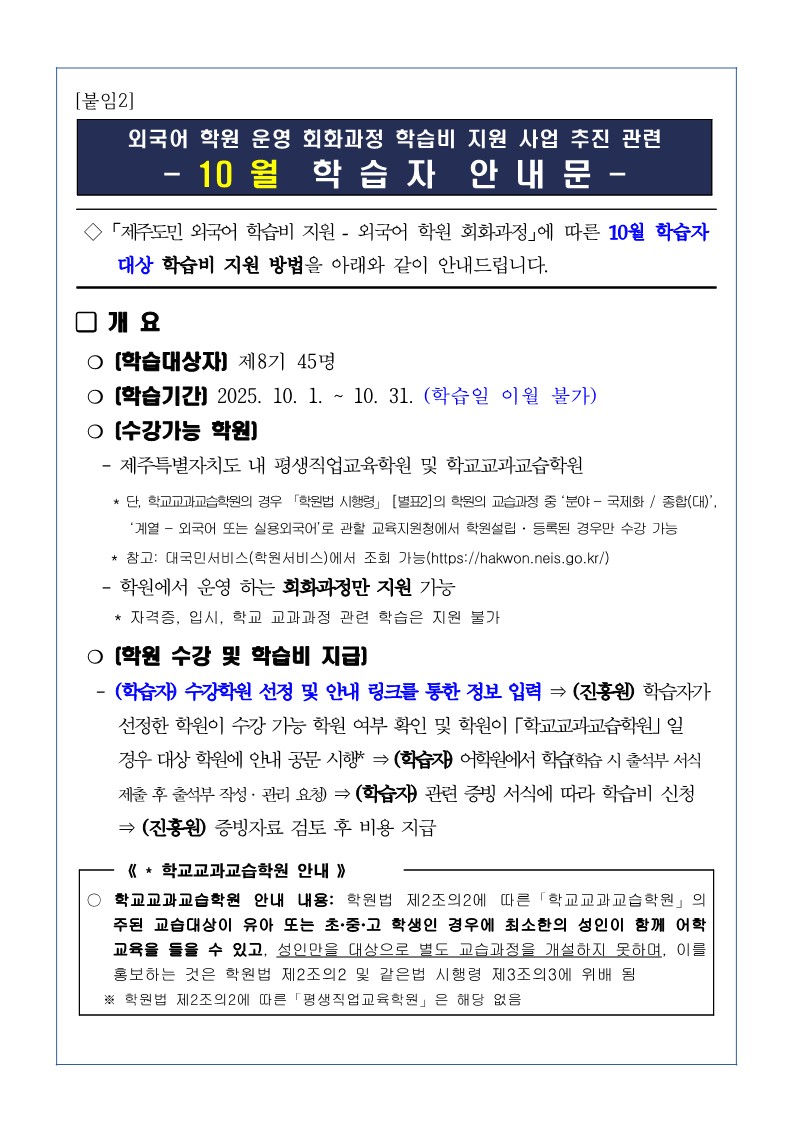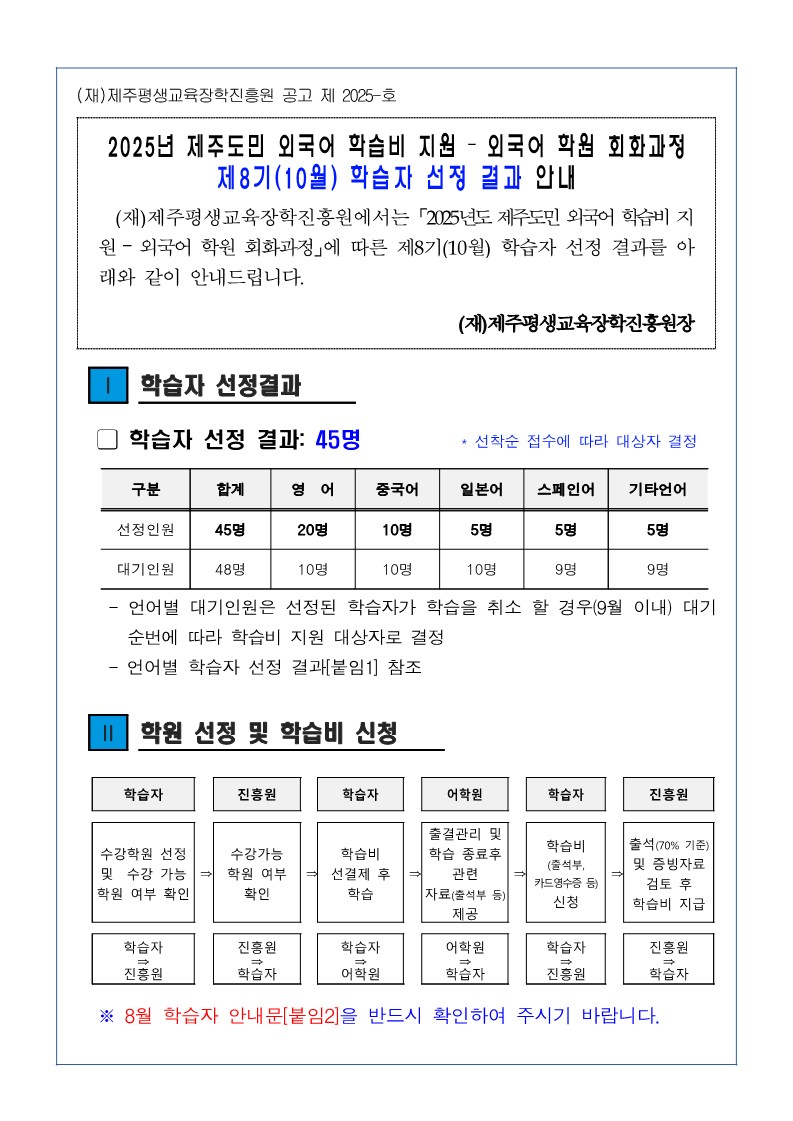 | 제 목 | 2025년 제주도민 외국어 학습비 지원 - 외국어 학원 회화과정 제8기(10월) 학습자 선정 결과 안내 | ||