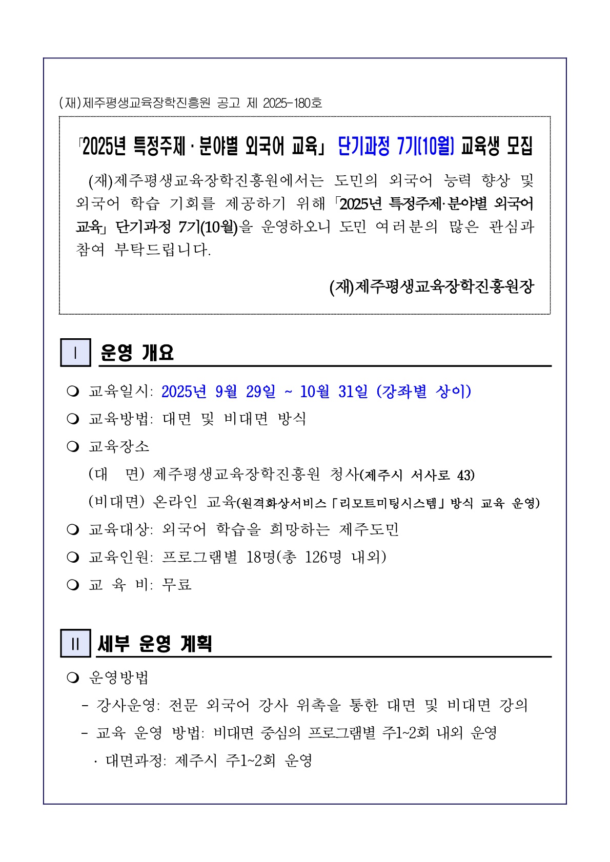 | 제 목 | 「2025년 특정주제.분야별 외국어 교육」 단기과정 7기(10월) 교육생 모집 | ||