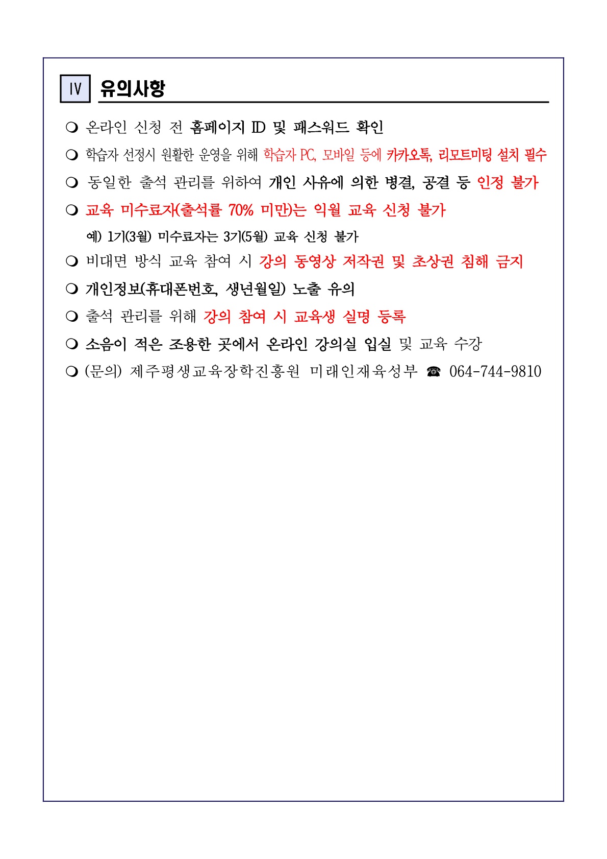 ※ 교육 미수료시(출석률 70%이상) 다음 차수 신청이 불가합니다. 이점 유의하시어 신청바랍니다. ※ 자세한 내용은 공고문의 강의시간표 및 강의계획서를 확인바랍니다. ※ 강의 난이도 및 시간표를 확인하지 않아 발생하는 문제는 신청자 본인에게 있습니다. ※ 기초 외국어 능력(읽기,말하기)이 필요한 강의입니다. 신청시 주의바랍니다.