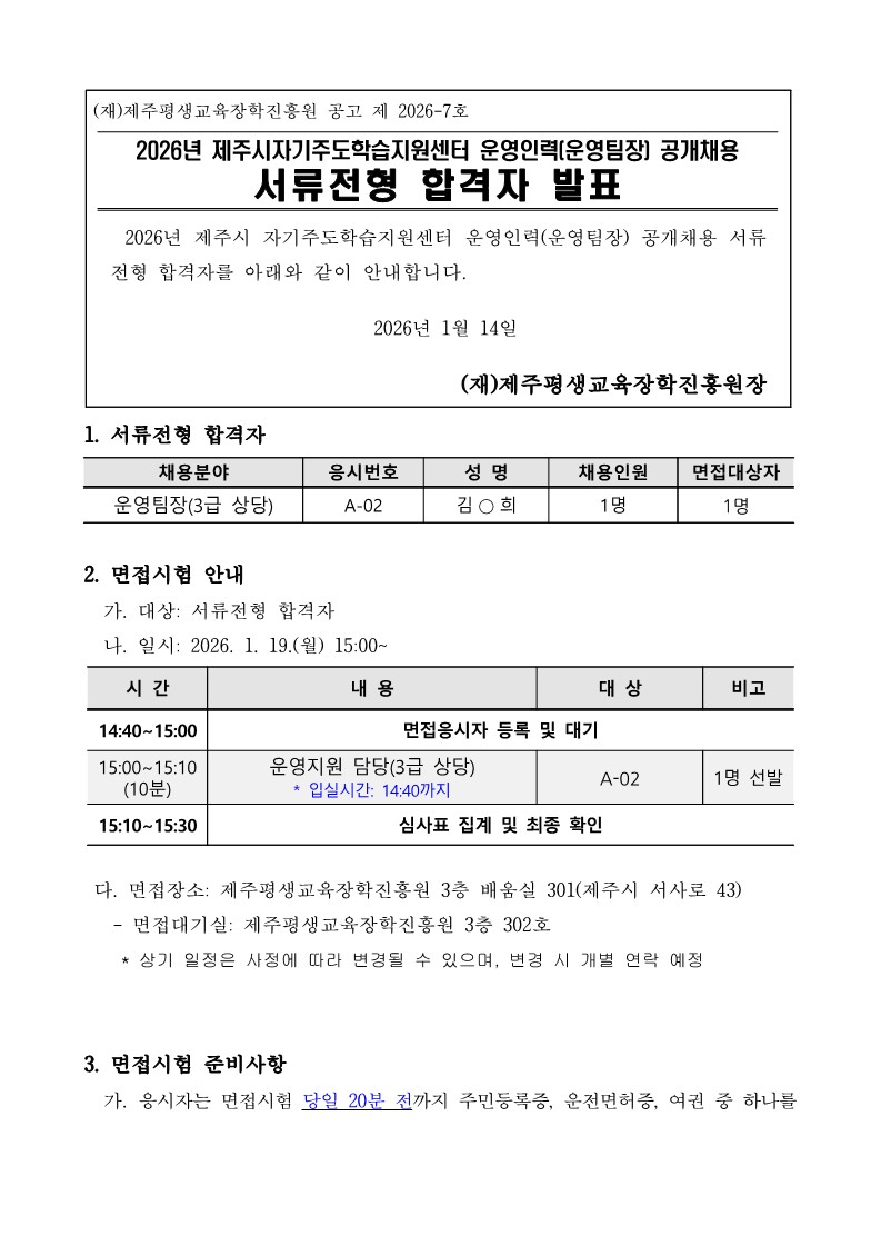 | 제 목 | 2026년 제주시자기주도학습지원센터 운영인력(운영팀장) 공개채용 서류전형 합격자 발표 | ||