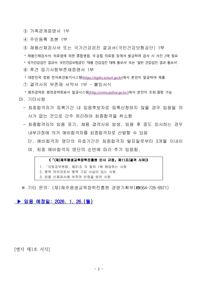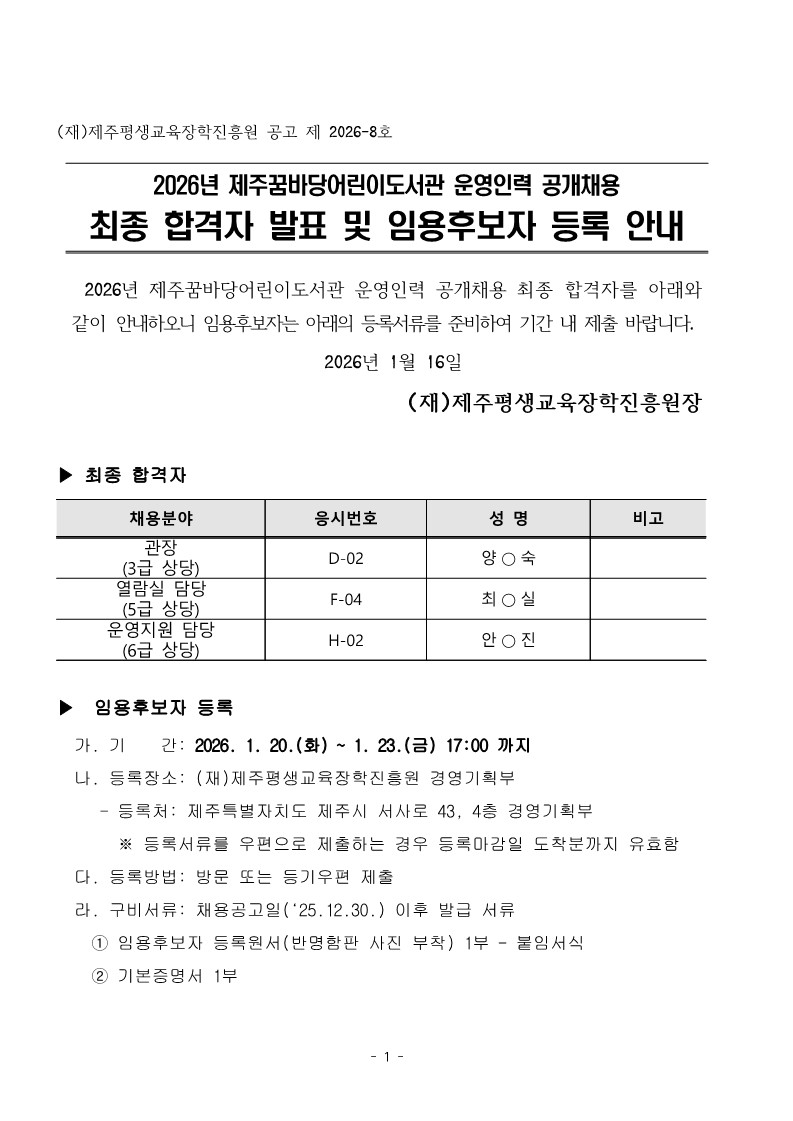 | 제 목 | 2026년 제주꿈바당어린이도서관 운영인력 공개채용 최종합격자 발표 및 임용후보자 등록 안내 | ||