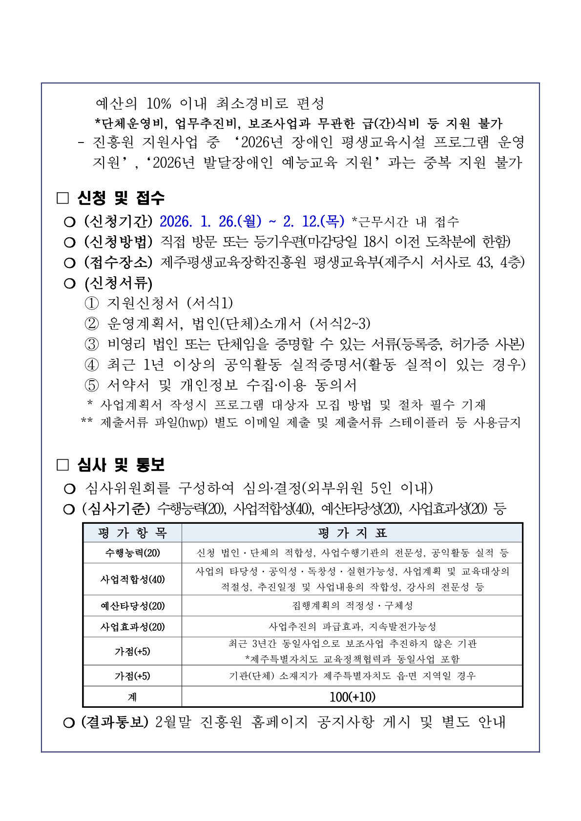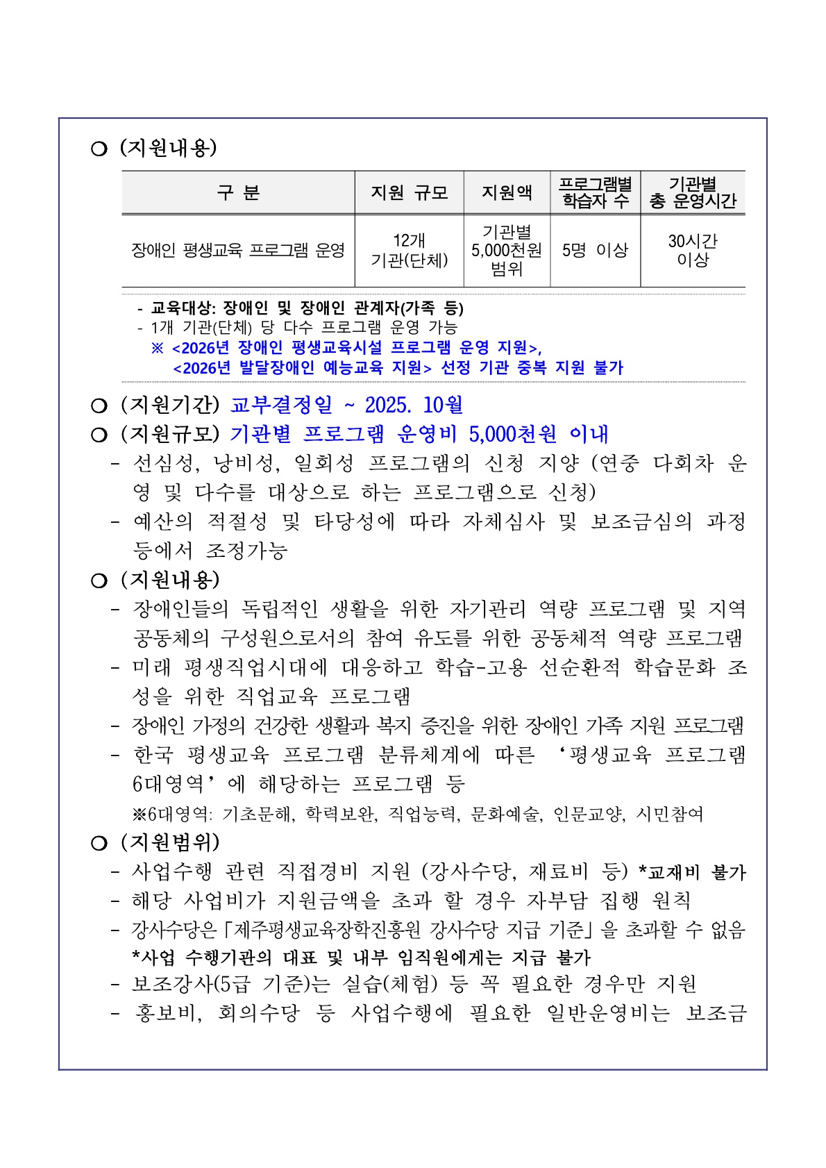 「2026년 장애인 평생교육 프로그램 지원」 공고