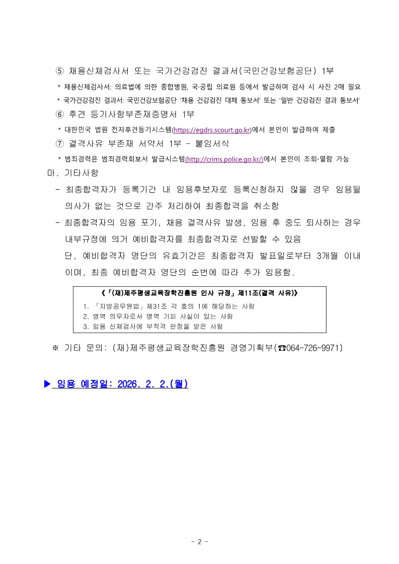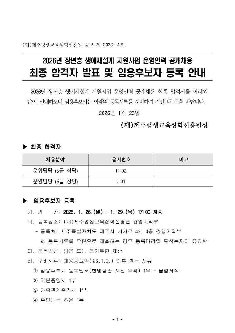| 제 목 | 2026년 장년층 생애재설계 지원사업 운영인력 공개채용 최종 합격자 발표 및 임용후보자 등록 안내 | ||