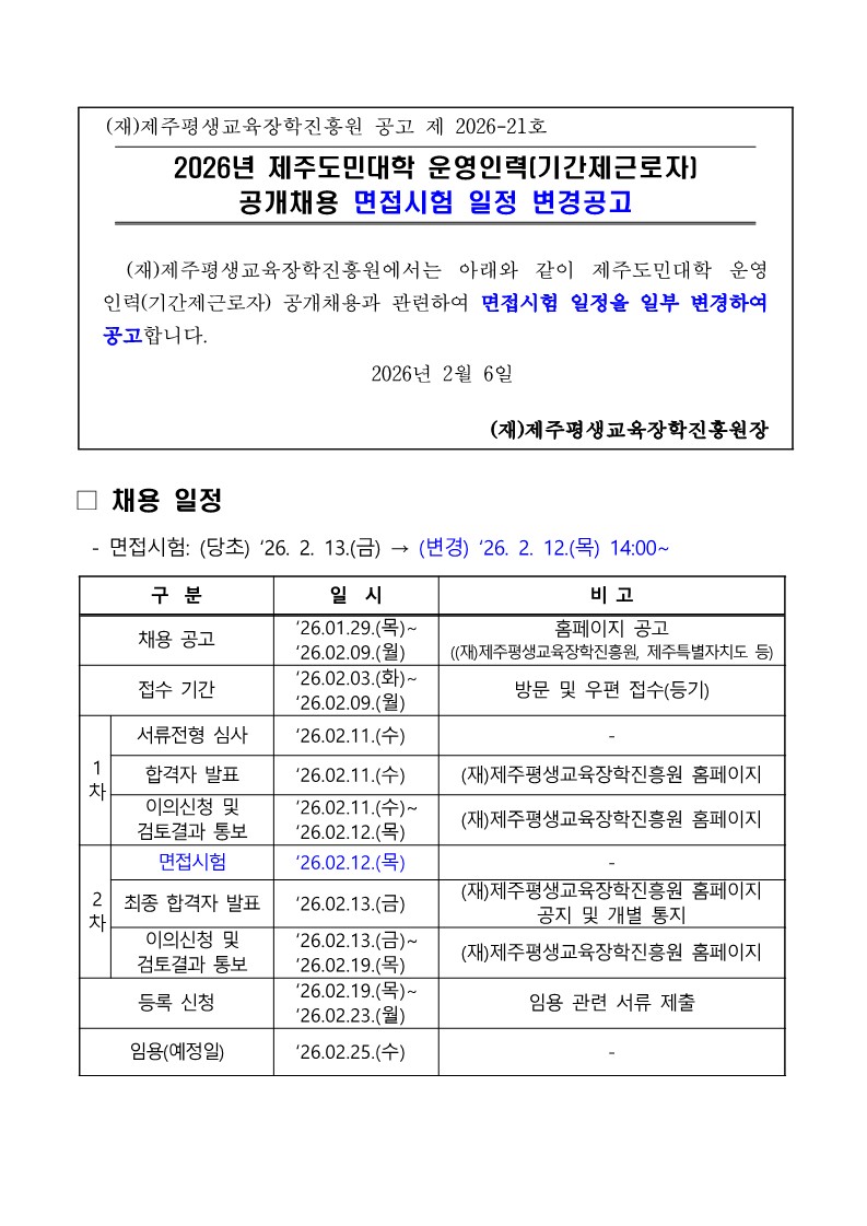 | 제 목 | 2026년 제주도민대학 운영인력(기간제근로자) 공개채용 계획 변경 공고 | ||