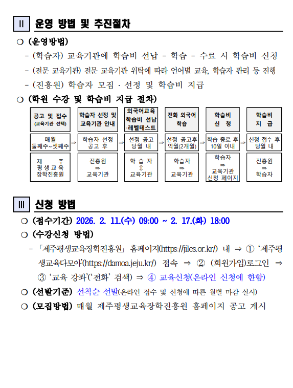 * 전화 외국어 학습비 지원은 제주평생교육장학흥원에서 지정한 교육기관에서 진행됩니다. * 선착순 모집이며, 선발자는 문자 개별 안내 예정입니다. ※ 수신거부 및 스팸처리 등으로 문자를 확인하지 못하여 발생하는 불이익에 대해서는 책임지지 않습니다. 선착순에 들었으나 문자 수신을 받지 못했을 경우(선발자 안내 이후), 미래인재육성부로 연락주시기 바랍니다. (신청하기) : 제주평생교육다모아 (damoa.jeju.kr) → 2월 11일(수)부터 신청