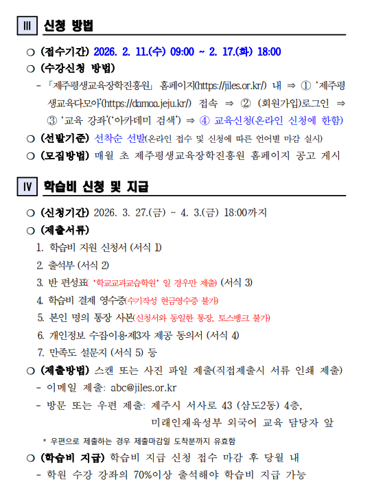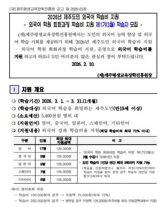 | 제 목 | 2026년 제주도민 외국어 학습비 지원-외국어 학원 회화과정 제1기(3월) 학습비 지원 학습자 모집 | ||