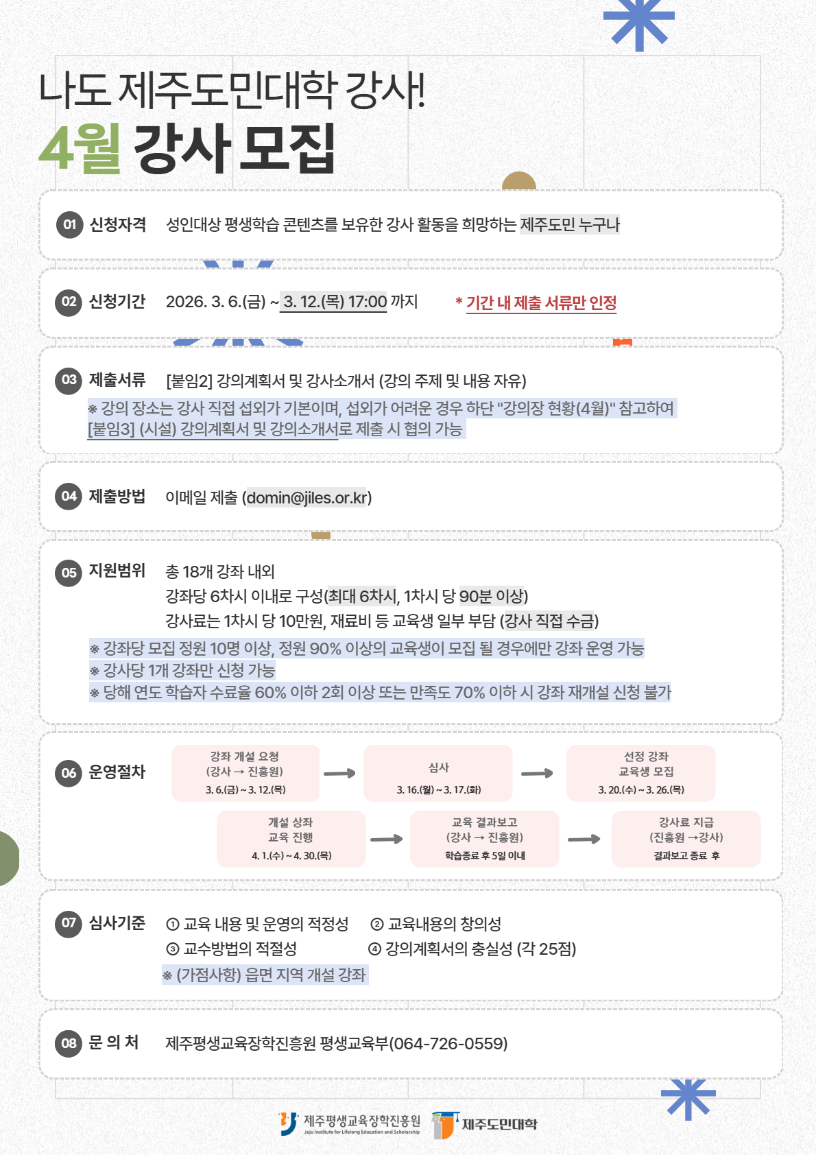 제주도민대학에서 4월 「나도 제주도민대학 강사!」 교육과정 도민 강사를 모집합니다. 관심있으신 분들의 많은 참여 바랍니다.