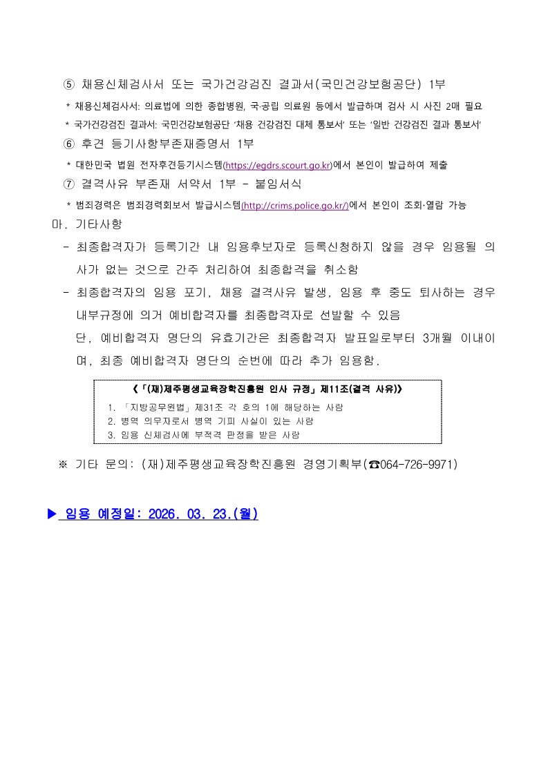 | 제 목 | 2026년 제주꿈바당어린이도서관 운영인력 공개채용 최종합격자 발표 및 임용후보자 등록 안내 | ||