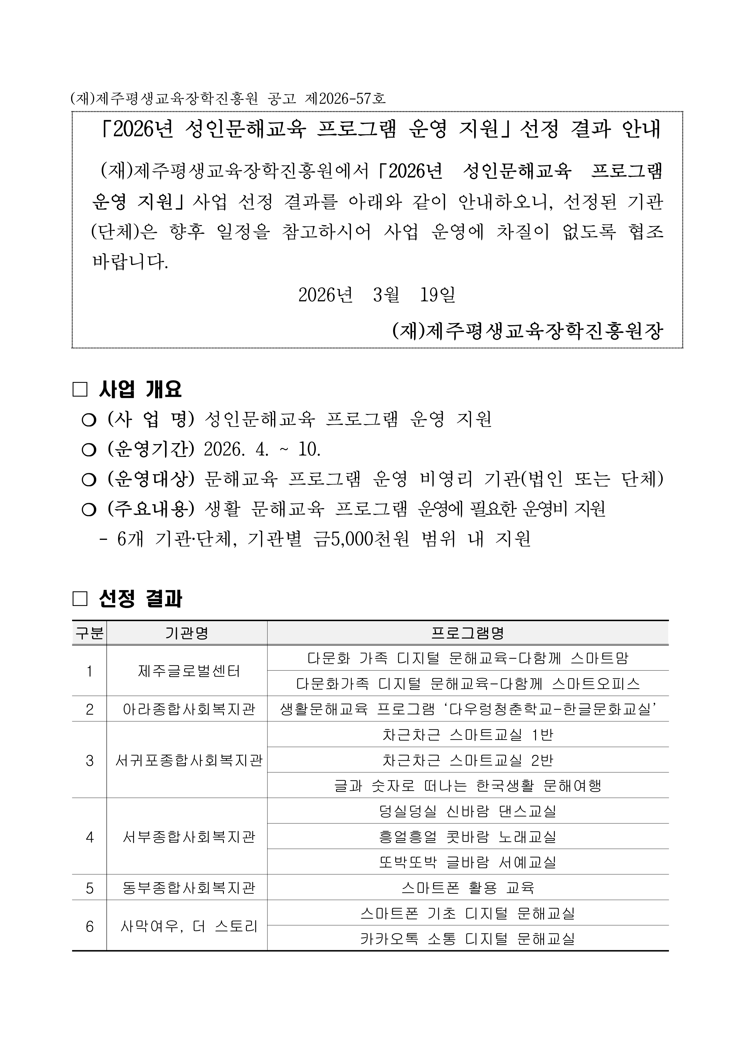2026년 성인문해교육 프로그램 운영 지원 선정 결과 안내