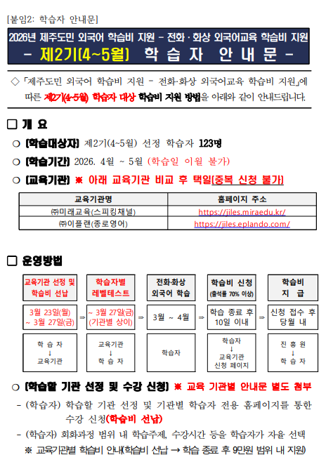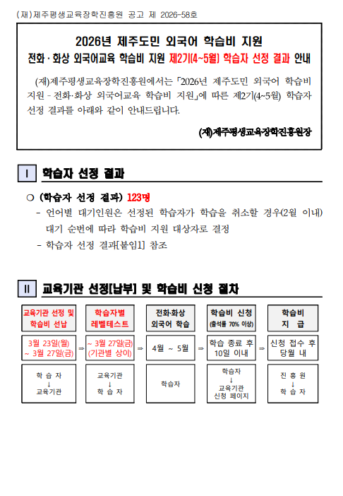 | 제 목 | 2026년 제주도민 외국어 학습비 지원 전화 화상 외국어교육 학습비 지원 제2기(4~5월) 학습자 선정 결과 안내 | ||