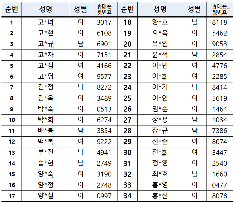 ❍ 사 업 명: 2026년 5060재능나눔활동지원(5060재능나눔활동가 지원) ❍ 신청기간: 2026. 3. 11.(수) ~ 3. 24.(화) ❍ 신청대상: 모집 공고일 기준 50 ~ 64세 제주도민 32명 (출생년월: 1961. 3. 11. ~ 1976. 3. 10.) ※ 사업 추진: 제주특별자치도 중장년 지원에 관한 조례 제6조 ❍ 신청방법: 담당자 이메일 제출 또는 방문접수 ❍ 선정방법: 내부 산정기준 점수 적용 합산 결과 고득점 순 ※ 동점자 발생으로 인한 총 34명 선정 ■선정결과 ❍ 선정인원: 총 34명 ![]() ※ 동점자 발생으로 인한 추가 선정