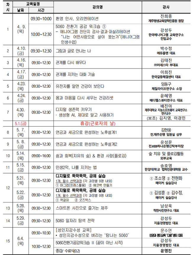 □ 개 요 ❍ 교 육 명:「2026년 탐나는 5060 인생학교 봄학기(18기)」 ❍ 과 정 명: 「탐나는 5060 인생학교 봄학기(18기)」 ❍ 운영기간: 2026. 4. 9.(목) ~ 6. 4.(목) ※ 5/1 (근로자의 날) 휴강 - 운영시간: 매주 목·금 09:30~12:30 ※ 외부 체험 운영(09:00~16:00)시 점심 식사비 개인 준비 및 비용 부담(참석자에 한함) - 총 15차시 46시간(외부 체험의 경우, 단순 이동 및 점심 시간은 교육 시간 미인정) ❍ 운영대상: 50~64세 제주도민 35명 ※ 시행근거: 제주특별자치도 중장년지원에 관한 조례 6조, 공고일 기준(1961. 3. 6. ~ 1976. 3. 5) ❍ 운영장소: (재)제주평생교육장학진흥원 5층 다목적홀 및 도내 일원 ❍ 교육비: 무료 (준비물: 해당 차시 스마트폰) ※ 외부 체험 운영(09:00~16:00)시 점심 식사비 참석자 개인 부담(1만원 내외, 1회) ❍ 교육방법: 집합대면(강의 + 실습 + 체험) ❍ 수료기준: 교육과정의 70%(11회) 이상 출석 시 수료증 발급