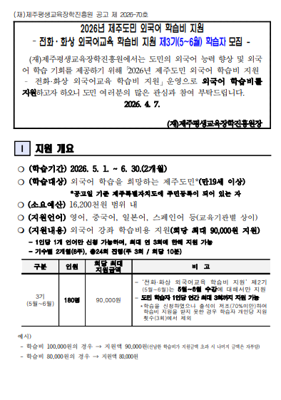 | 제 목 | 2026년 제주도민 외국어 학습비 지원 - 전화 화상 외국어교육 학습비 지원 제3기(5~6월) 학습자 모집 - | ||