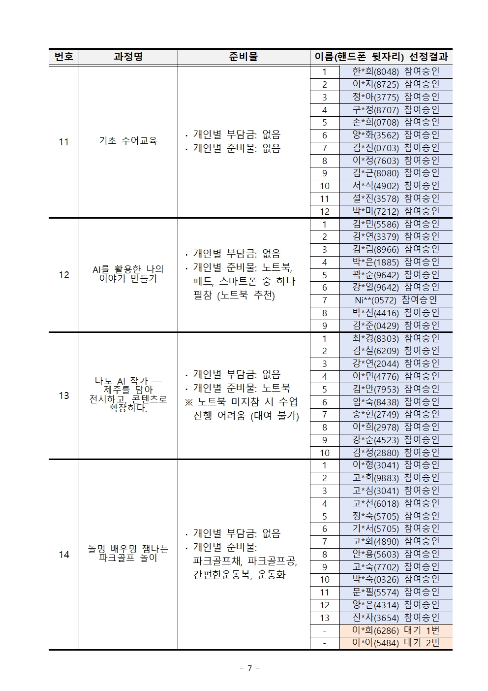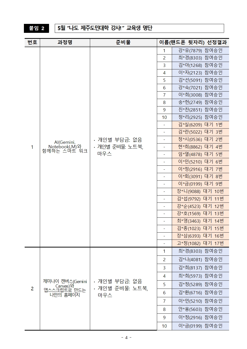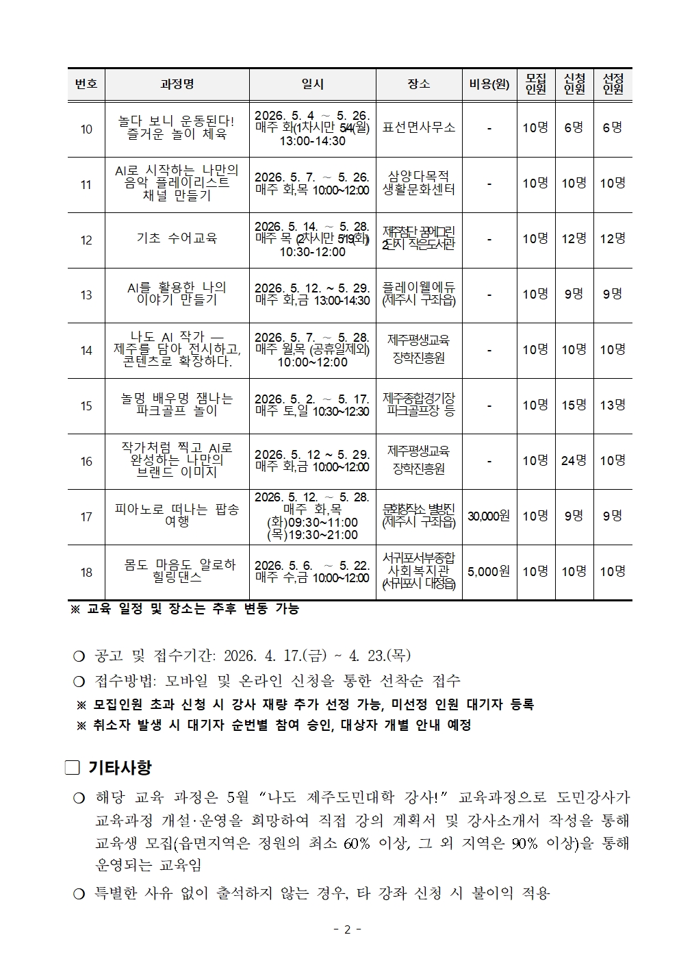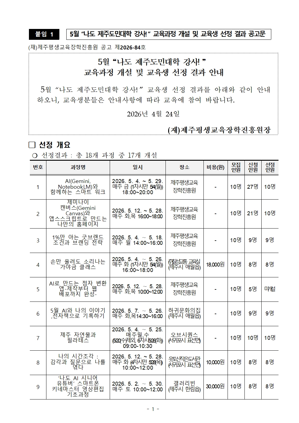 (붙임2) 2026년 「제주도민대학」 5월 나도 제주도민대학 강사 교육 과정 개설 및 교육생 선정 결과 공고.pdf (309 KBytes)