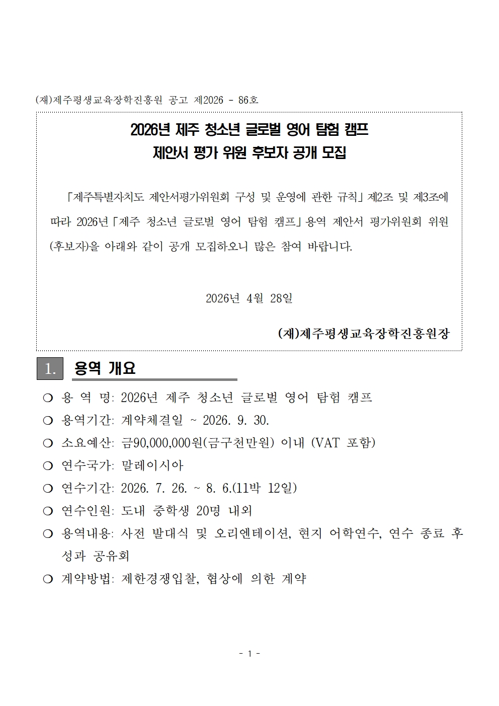 | 제 목 | 2026년 제주 청소년 글로벌 영어 탐험 캠프 제안서 평가위원 후보자 공개 모집 공고 | ||