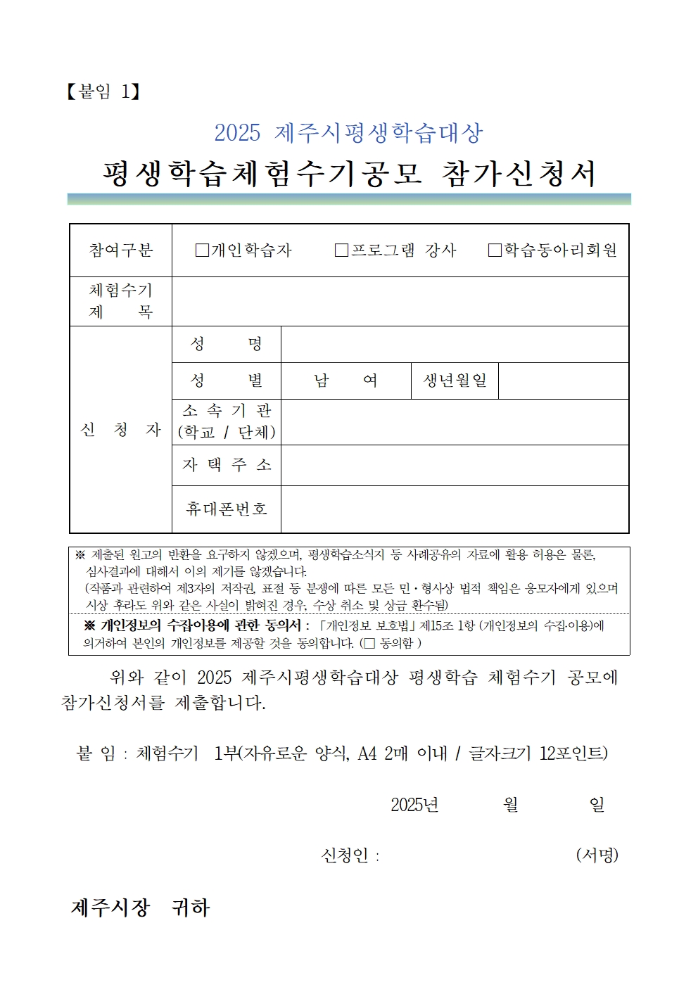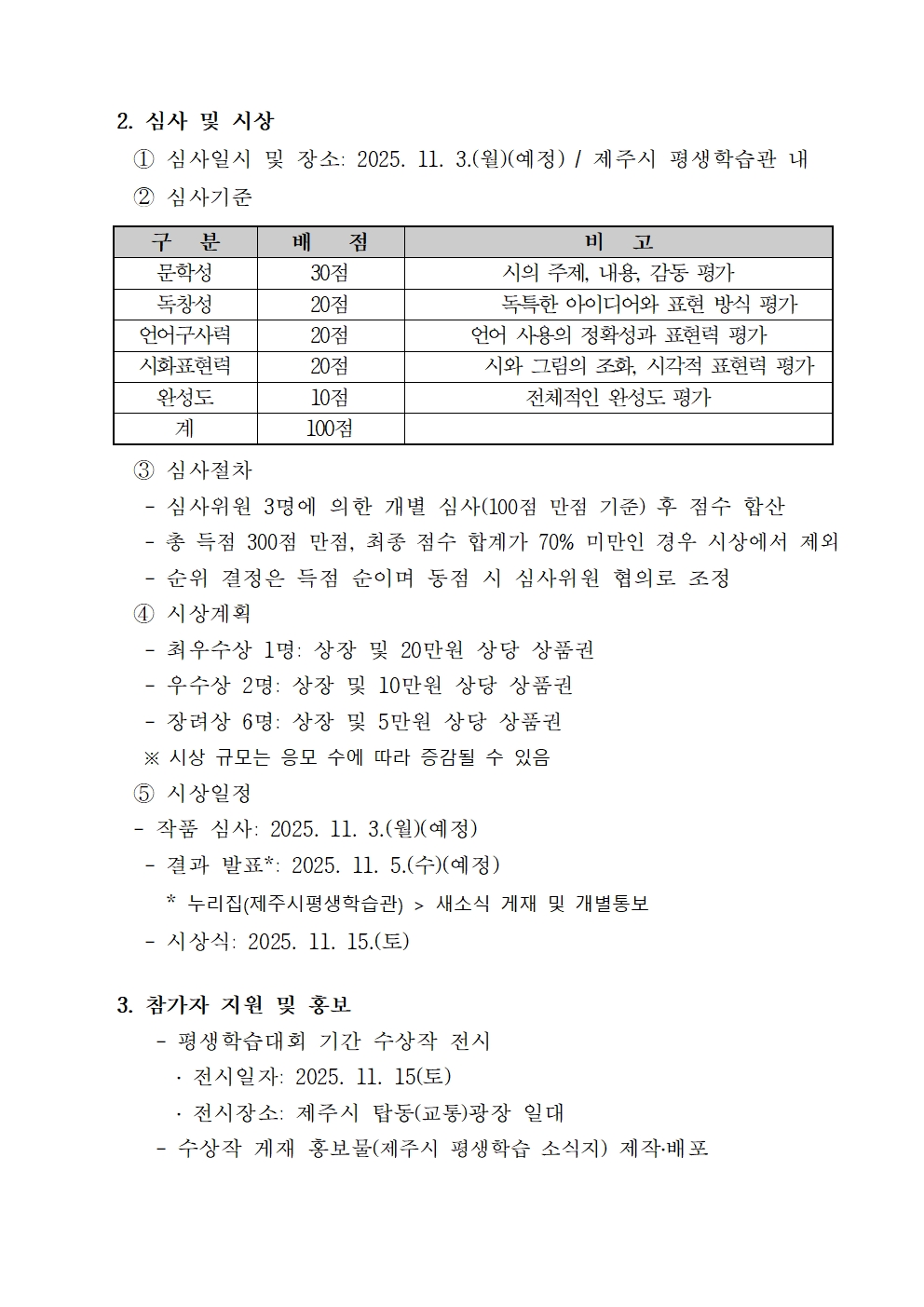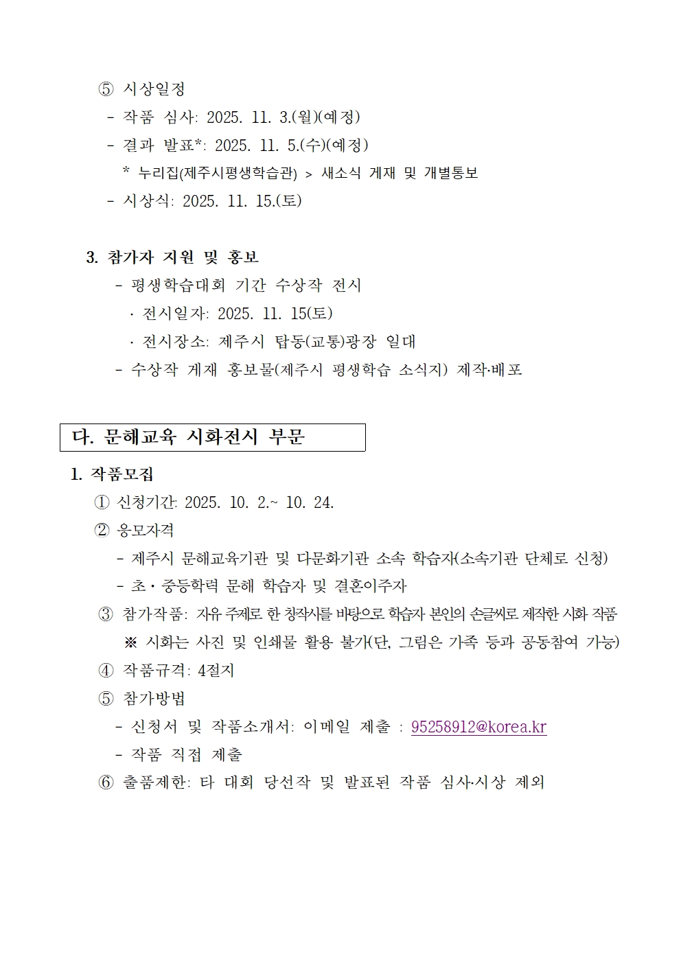 2025년 제주시평생학습대상(체험수기·작품전시·문해교육시화전) 공모 안내