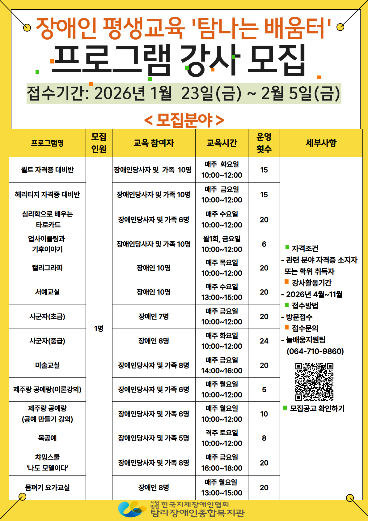 | 제 목 | 2026 장애인 평생교육 ‘탐나는 배움터’ 프로그램 강사 모집 공고 | ||