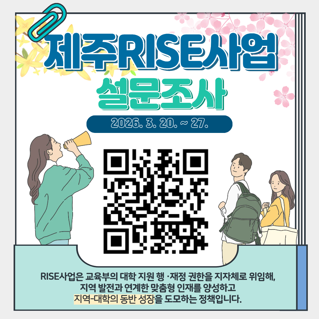 제주RISE 사업을 통해 지역과 대학이 동반성장을 도모할 수 있도록 실시하는 설문조사를 붙임과 같이 안내드립니다. |