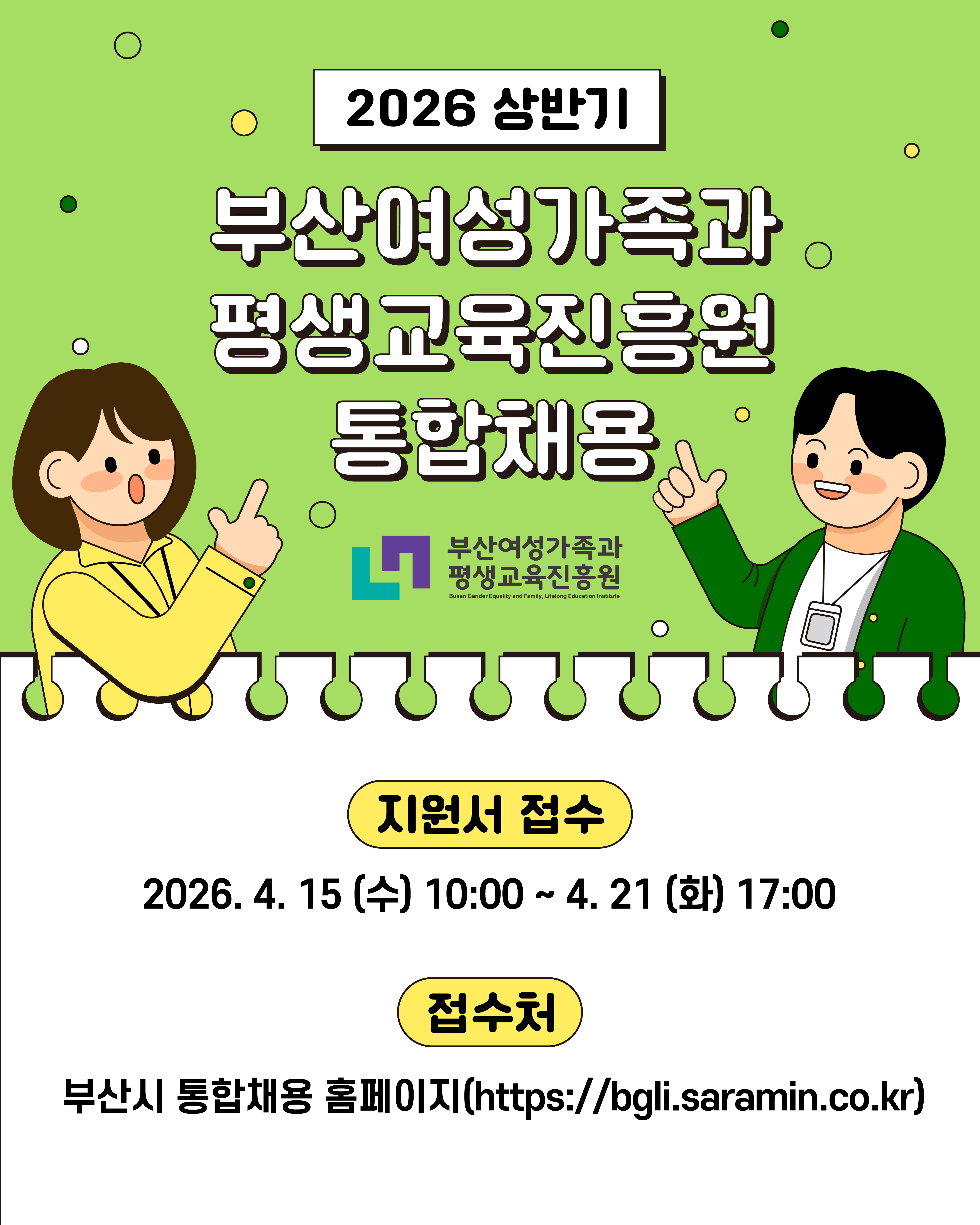 2026년 상반기 부산여성가족과 평생교육진흥원 통합채용 공고를 붙임과 같이 안내드립니다. |