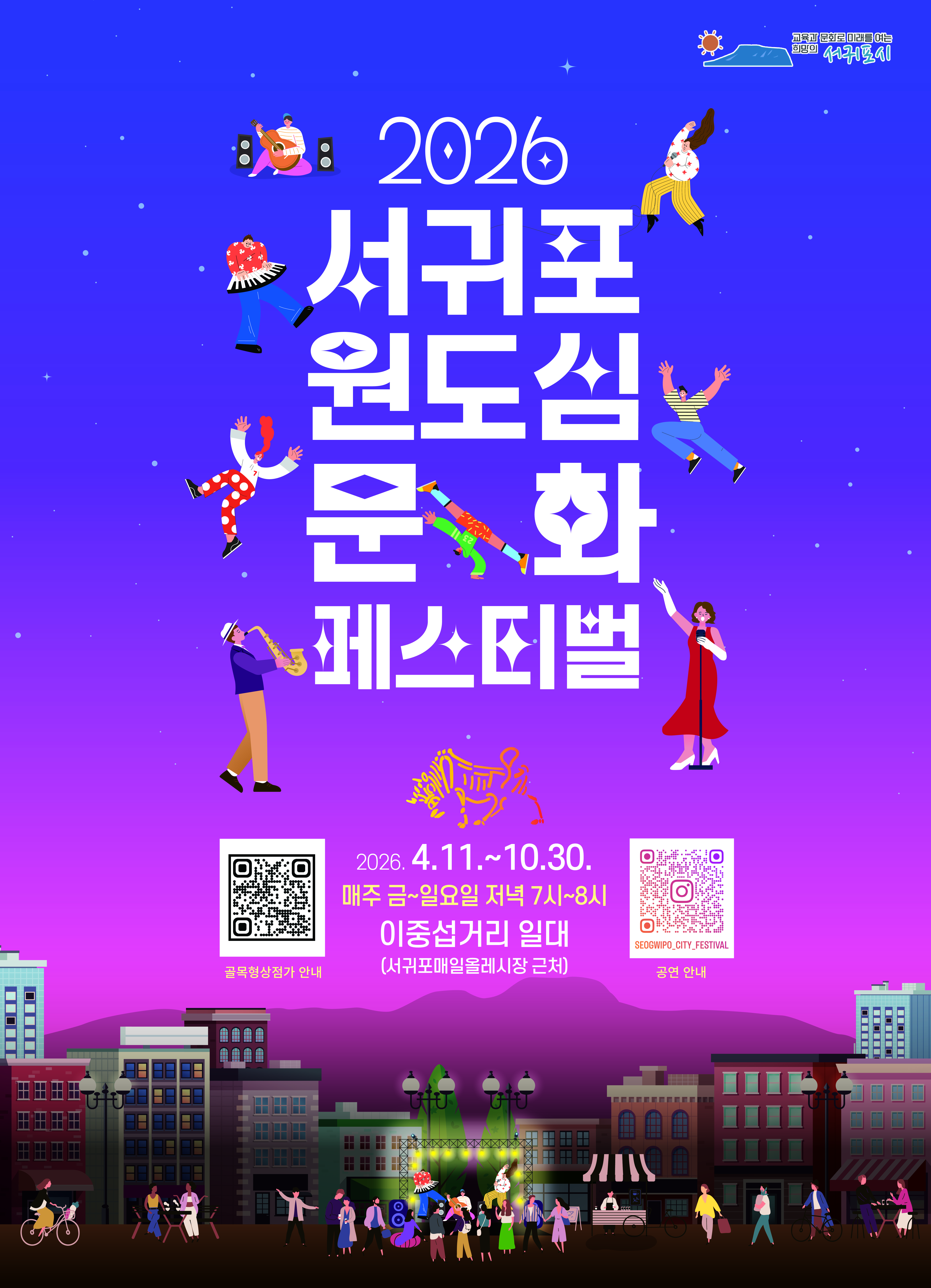「2026 서귀포 원도심 문화페스티벌」개최를 붙임과 같이 안내드립니다. 가. 행 사 명: 2026 서귀포 원도심 문화페스티벌 나. 일 시: 2026. 4. 11.(토)~10. 30.(금) / 매주 금·토·일 저녁 7시~8시 ※ 개막주간 특별 공연: 2026. 4. 11.(토)~12.(일) 다. 장 소: 이중섭로 일원(서귀포매일올레시장 근처) 라. 주요내용: 지역 예술인 및 청소년 동아리 공연, 상권 연계 이벤트 등 |