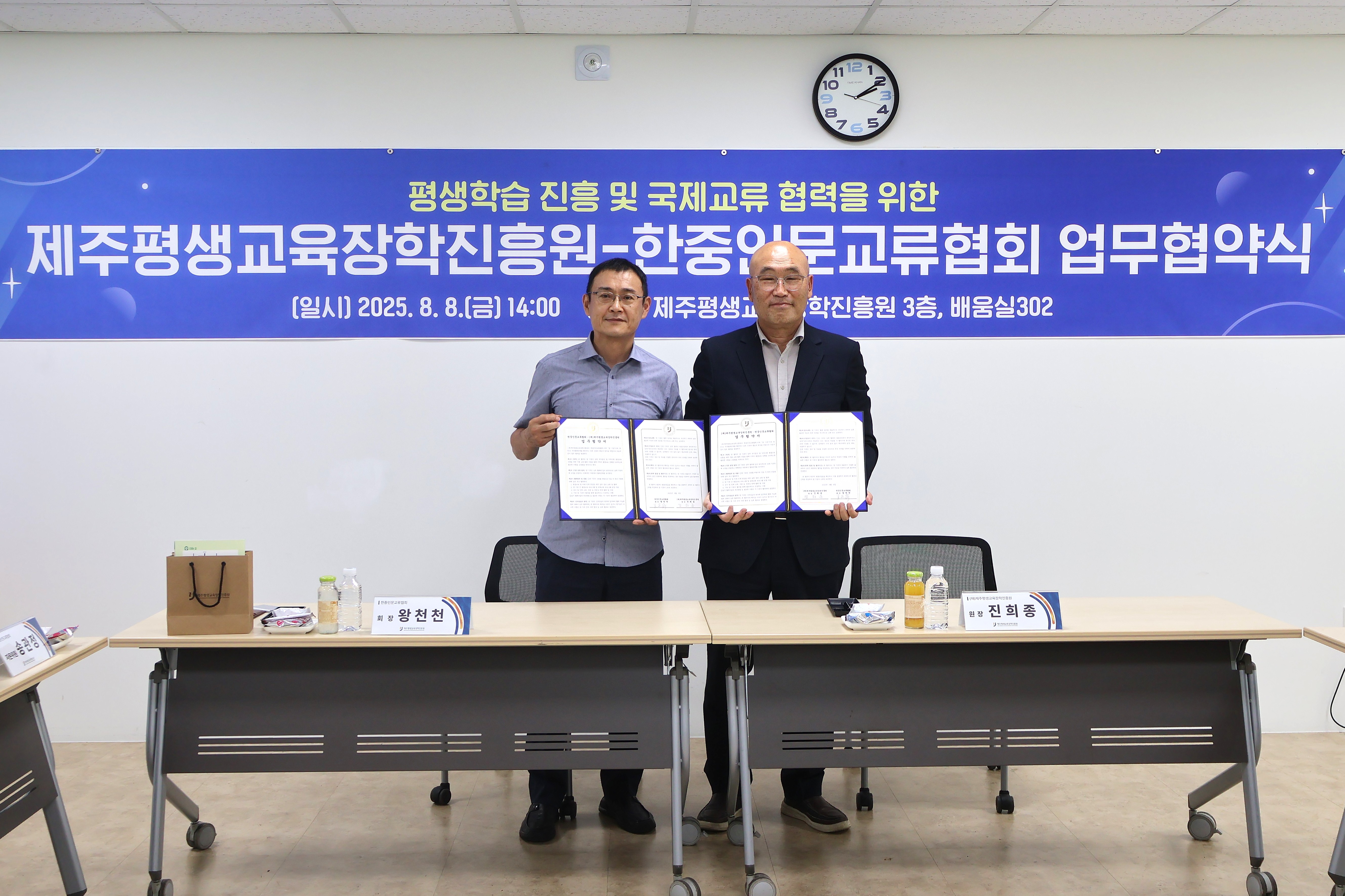 □ 제주평생교육장학진흥원(원장 진희종)은 지난 8일 한중인문교류협회(회장 왕천천)와 한·중 인문 교류 활성화를 위한 업무협약을 체결했다.