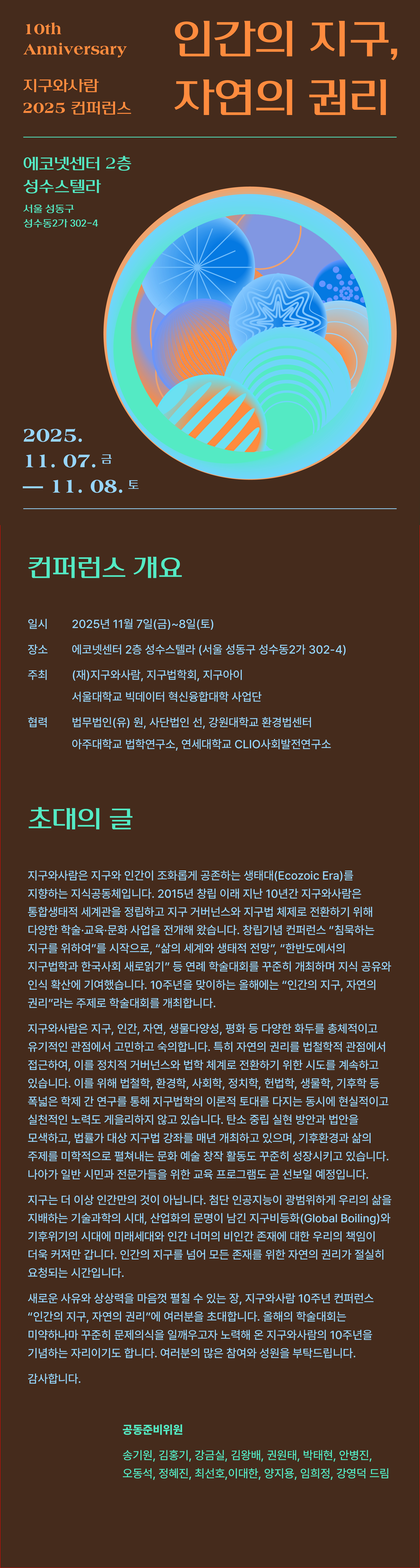□ 이번 행사는 (재)지구와사람 창립 10주년을 기념해 열리는 행사로, 지구법학회·지구아이·서울대학교 빅데이터 혁신융합대학이 공동 주최한다. 행사에는 국내외 생태·법학·환경 분야 전문가 100여 명이 참여할 예정이다.