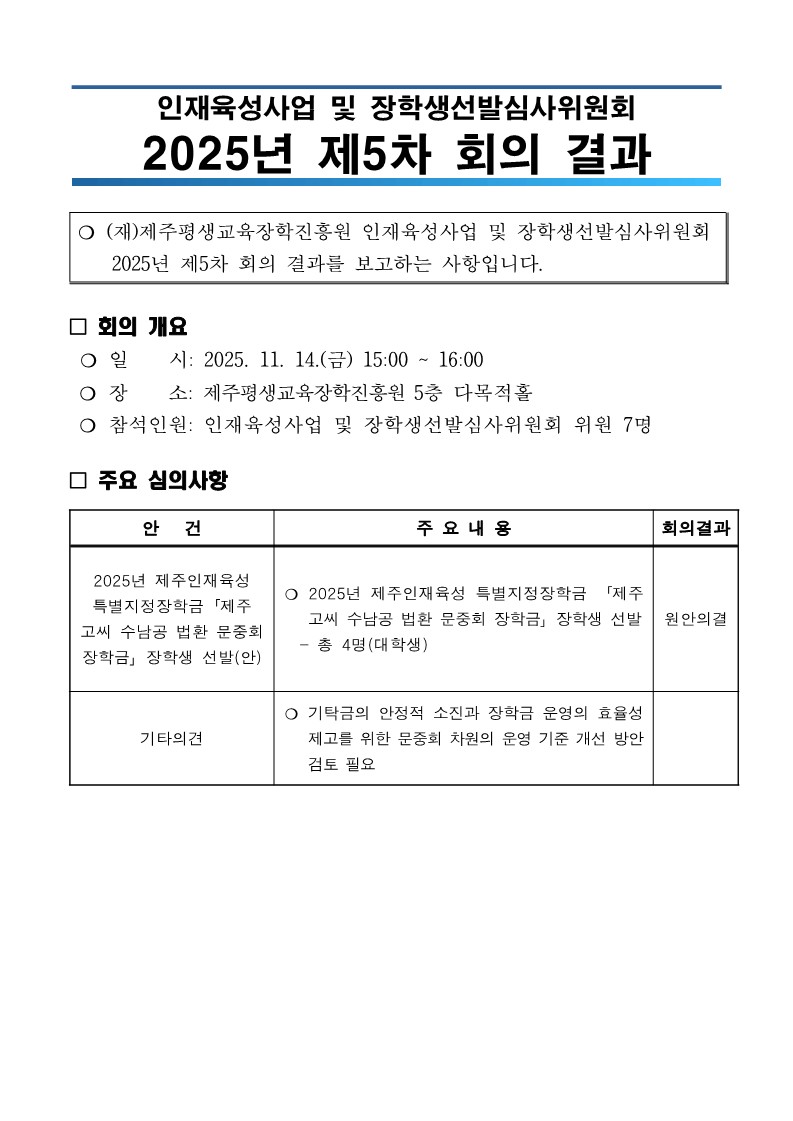 2025년 제5차 인재육성사업 및 장학생선발심사위원회 회의 결과
